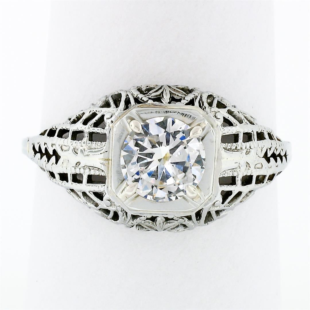An art deco solid 18k white gold filigree engagement ring, with 1 GIA Certified old transitional cut natural diamond (I - VS2 ; 0.71ct). The ring is size 7.5, weighs a total of 2.23 grams, and measures 10.5mm wide. Comes with all original relevant certifications.