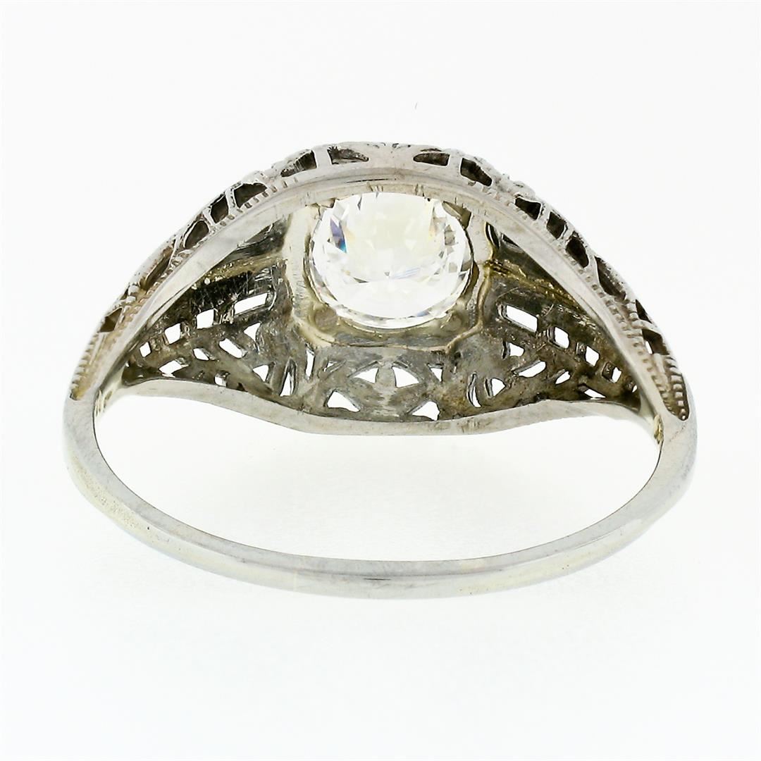 An art deco solid 18k white gold filigree engagement ring, with 1 GIA Certified old transitional cut natural diamond (I - VS2 ; 0.71ct). The ring is size 7.5, weighs a total of 2.23 grams, and measures 10.5mm wide. Comes with all original relevant certifications.