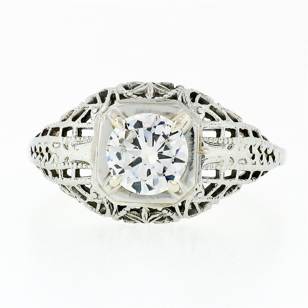 An art deco solid 18k white gold filigree engagement ring, with 1 GIA Certified old transitional cut natural diamond (I - VS2 ; 0.71ct). The ring is size 7.5, weighs a total of 2.23 grams, and measures 10.5mm wide. Comes with all original relevant certifications.