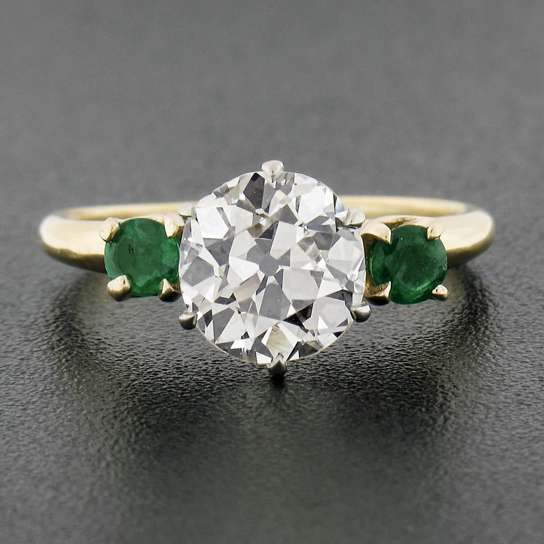 Antique 18k Gold & Platinum 2.02ct GIA European Diamond w/ Emerald 3 Stone Ring