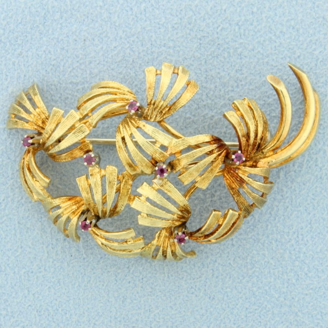 In 18K yellow gold, it contains seven .02ct round rubies. The pin is 1 3/4 inch long.           10.4g