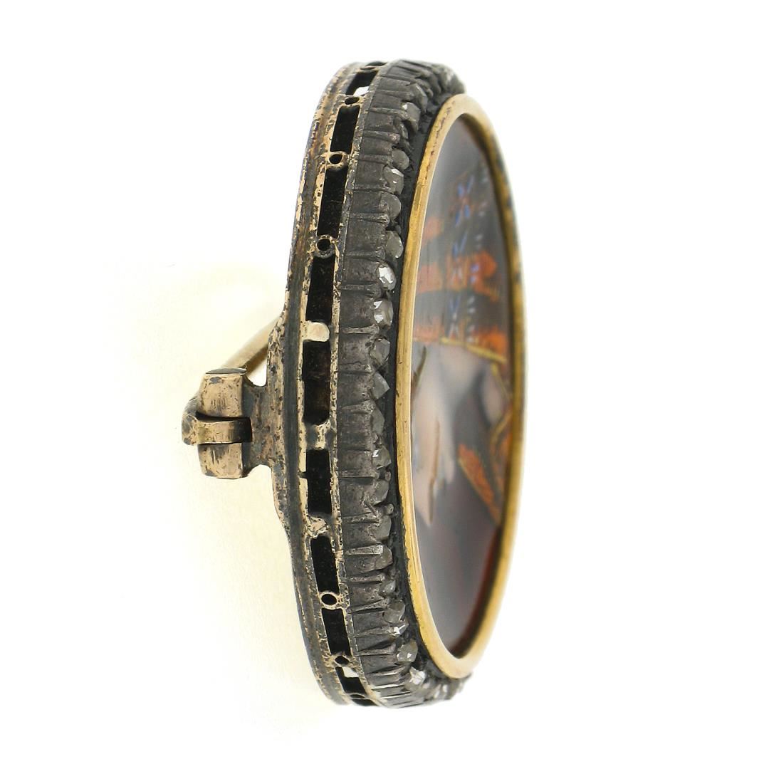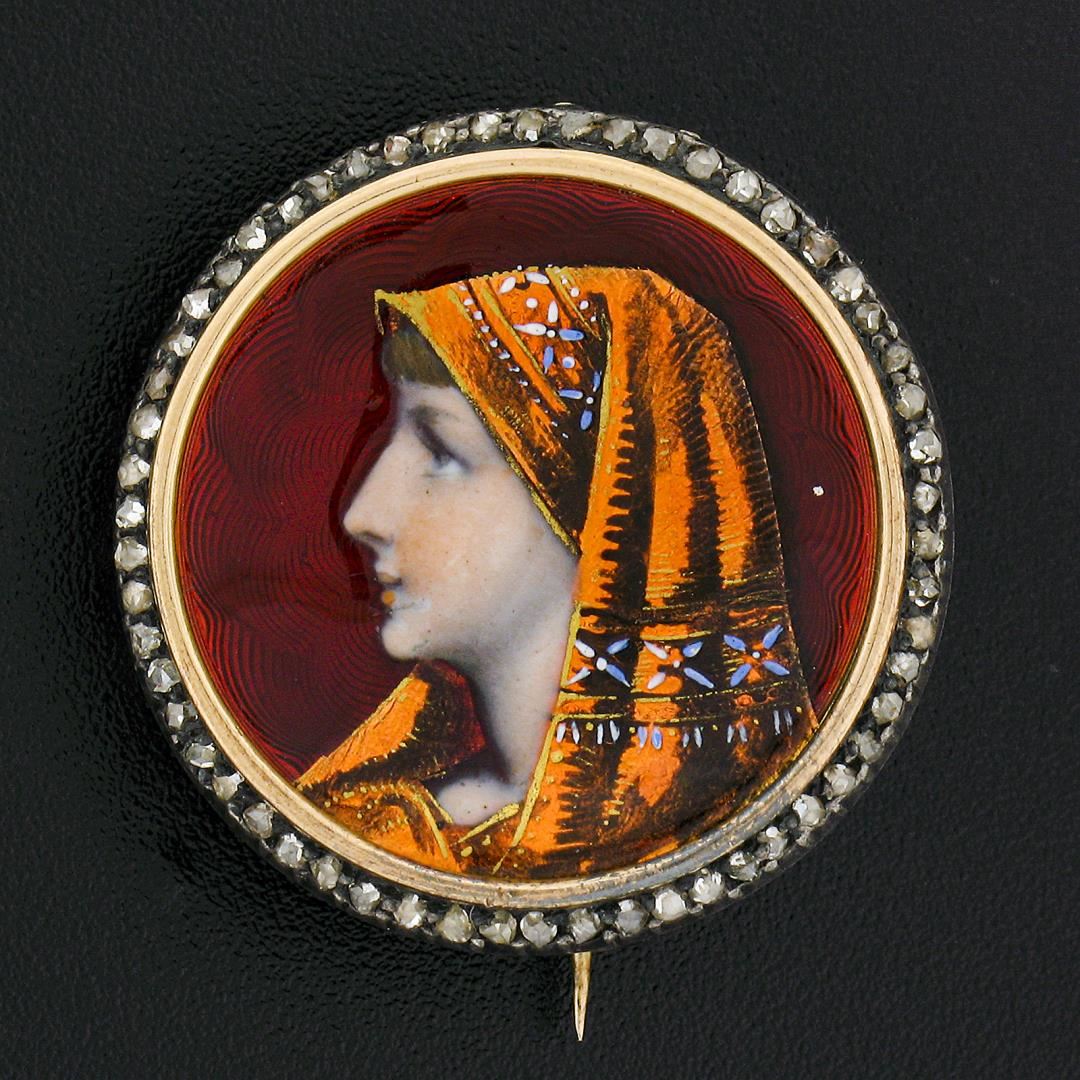 An antique solid 18k yellow gold & silver enamel portrait brooch, with numerous of old rose cut natural diamonds. Measures 26.5mm in diameter and weighs a total of 8.36 grams.