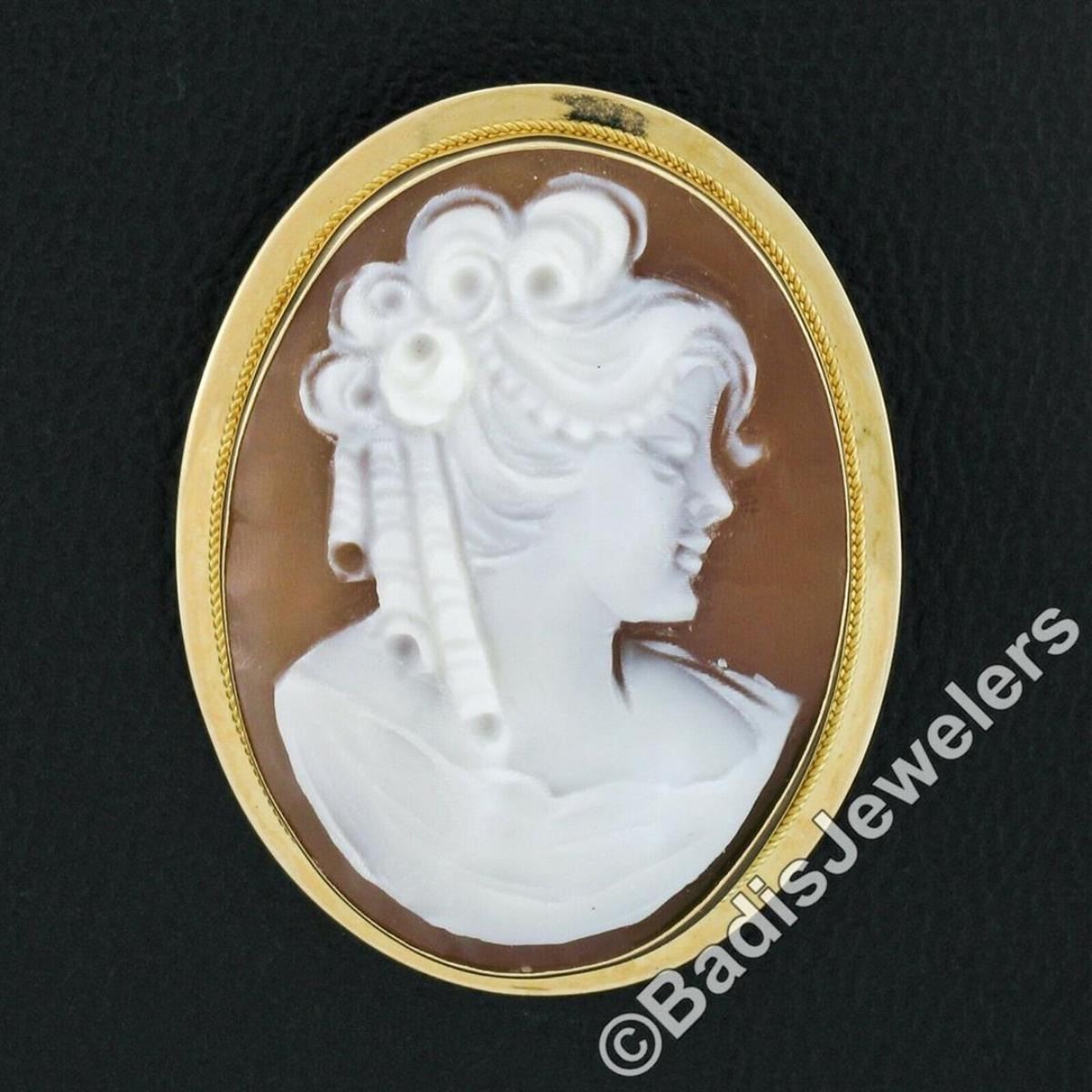 An antique 18kt yellow gold pendant or brooch featuring a 29.45x22.20mm oval carved shell cameo. The pendant weighs a total of 4.75 grams, measures 39.10x25.95mm including the bail, and the inside of the bail measures 4.25x2.15mm.