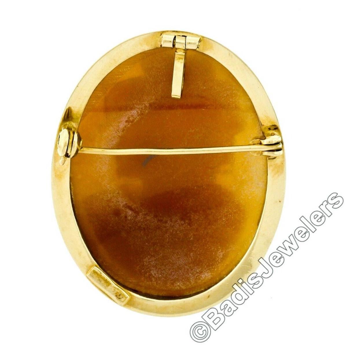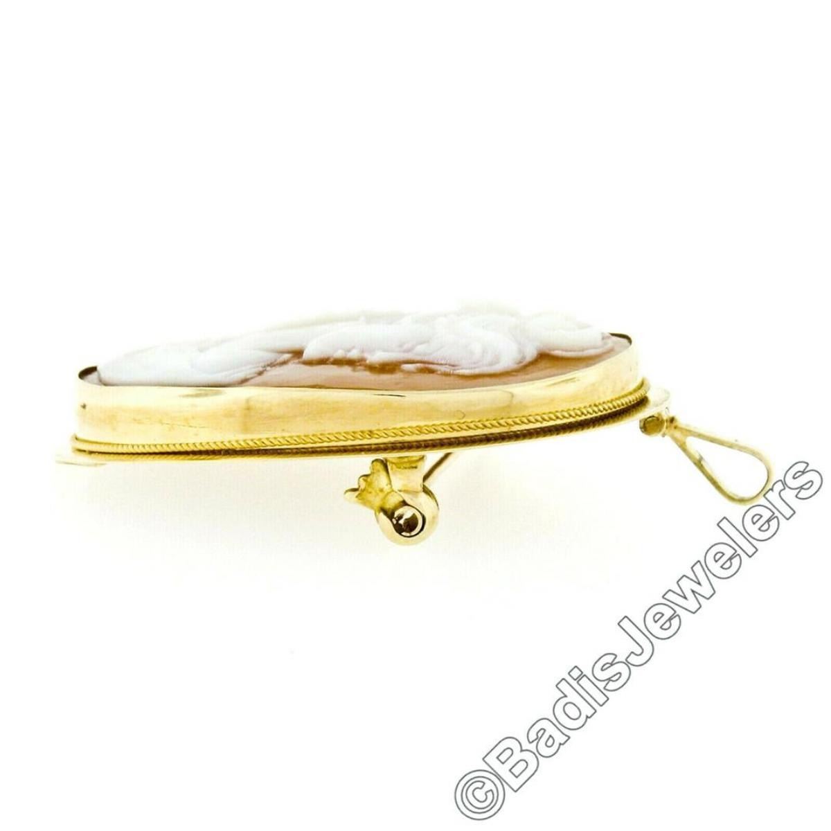 An antique 18kt yellow gold pendant or brooch featuring a 29.45x22.20mm oval carved shell cameo. The pendant weighs a total of 4.75 grams, measures 39.10x25.95mm including the bail, and the inside of the bail measures 4.25x2.15mm.