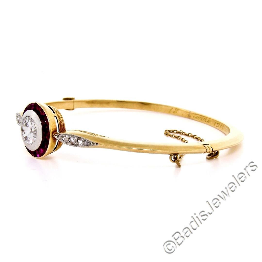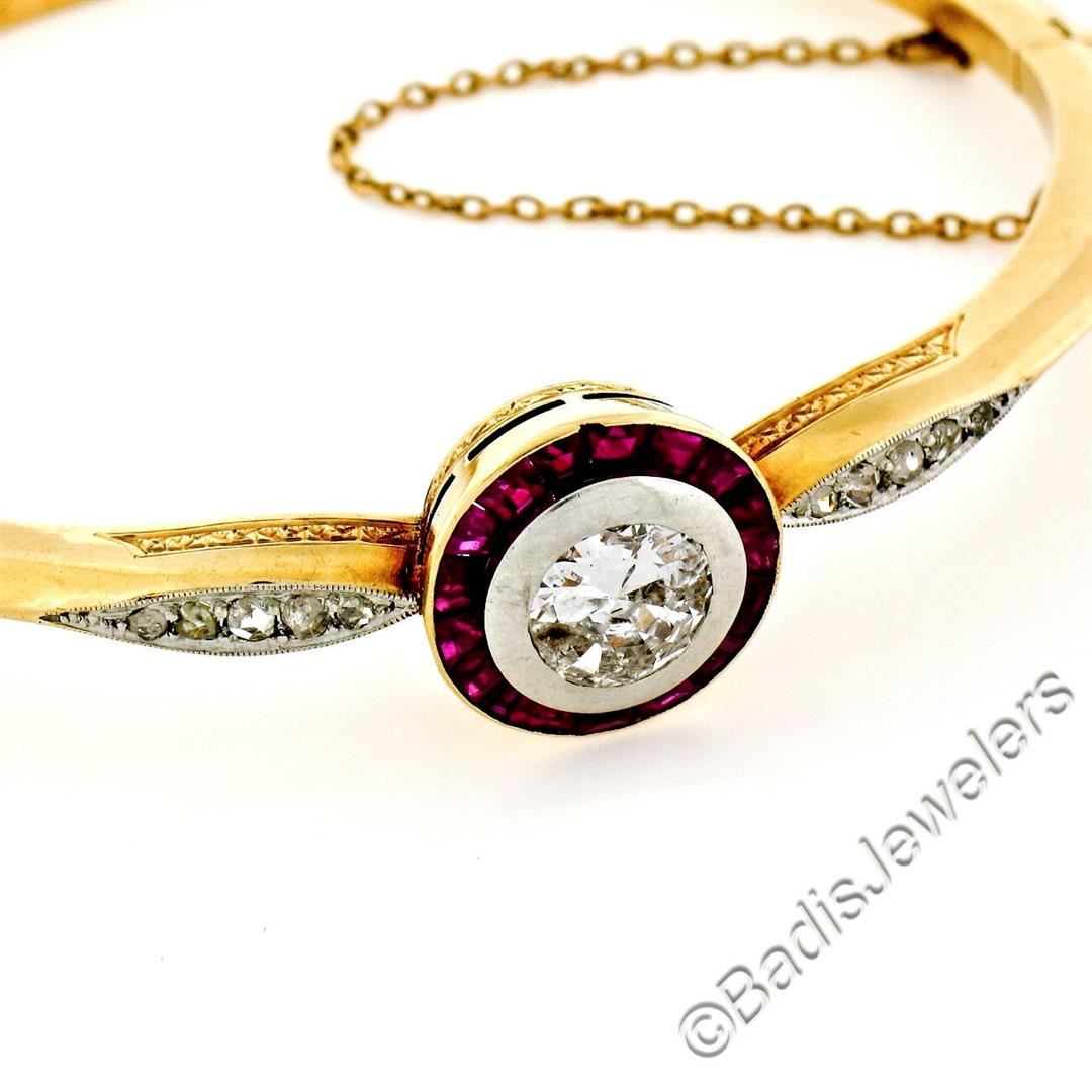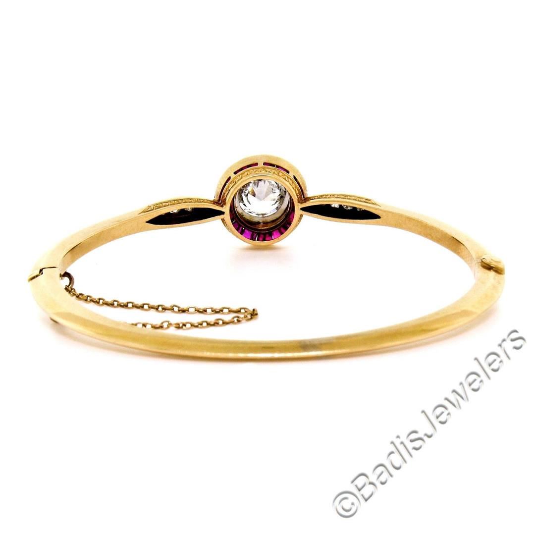 An Edwardian era 18kt yellow gold and platinum bangle bracelet with a 1.40ct old European cut diamond (H - I2) surrounded by a 0.85ctw calibre cut ruby halo and accented by 0.60ctw of rose cut diamonds (H/I - SI2). It weighs a total of 12.46 grams, measures 14.20mm wide, and measures 6.5 inches in length.