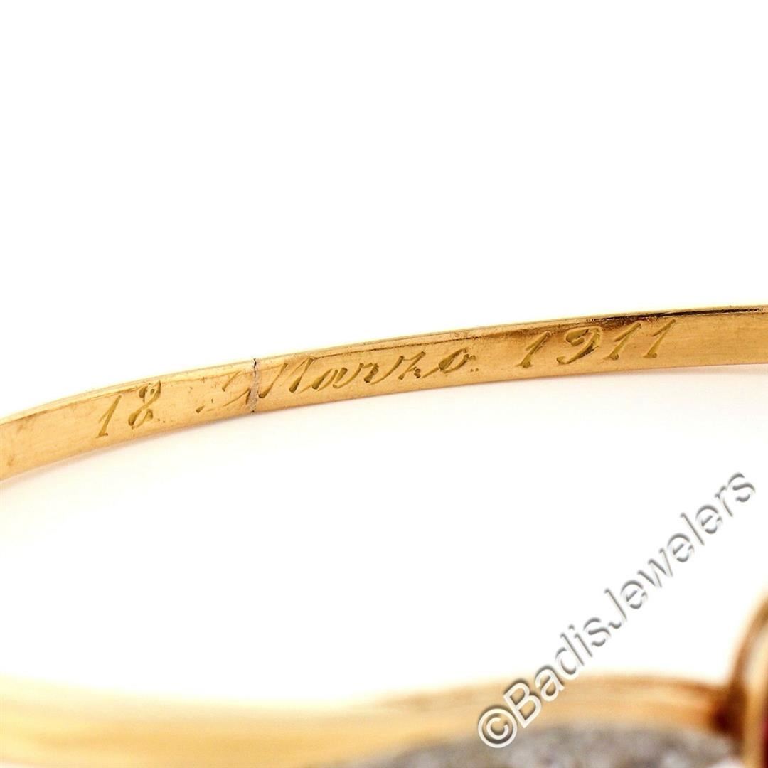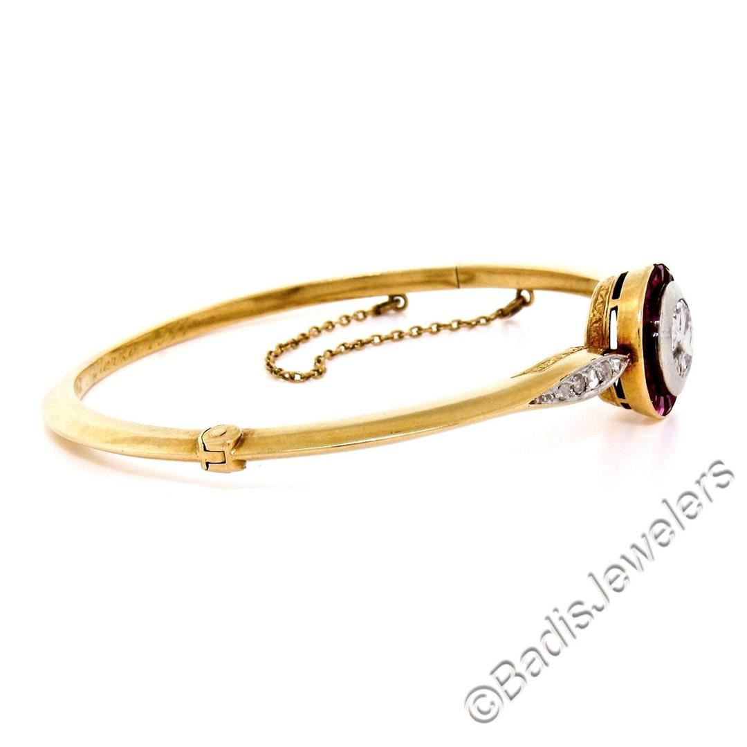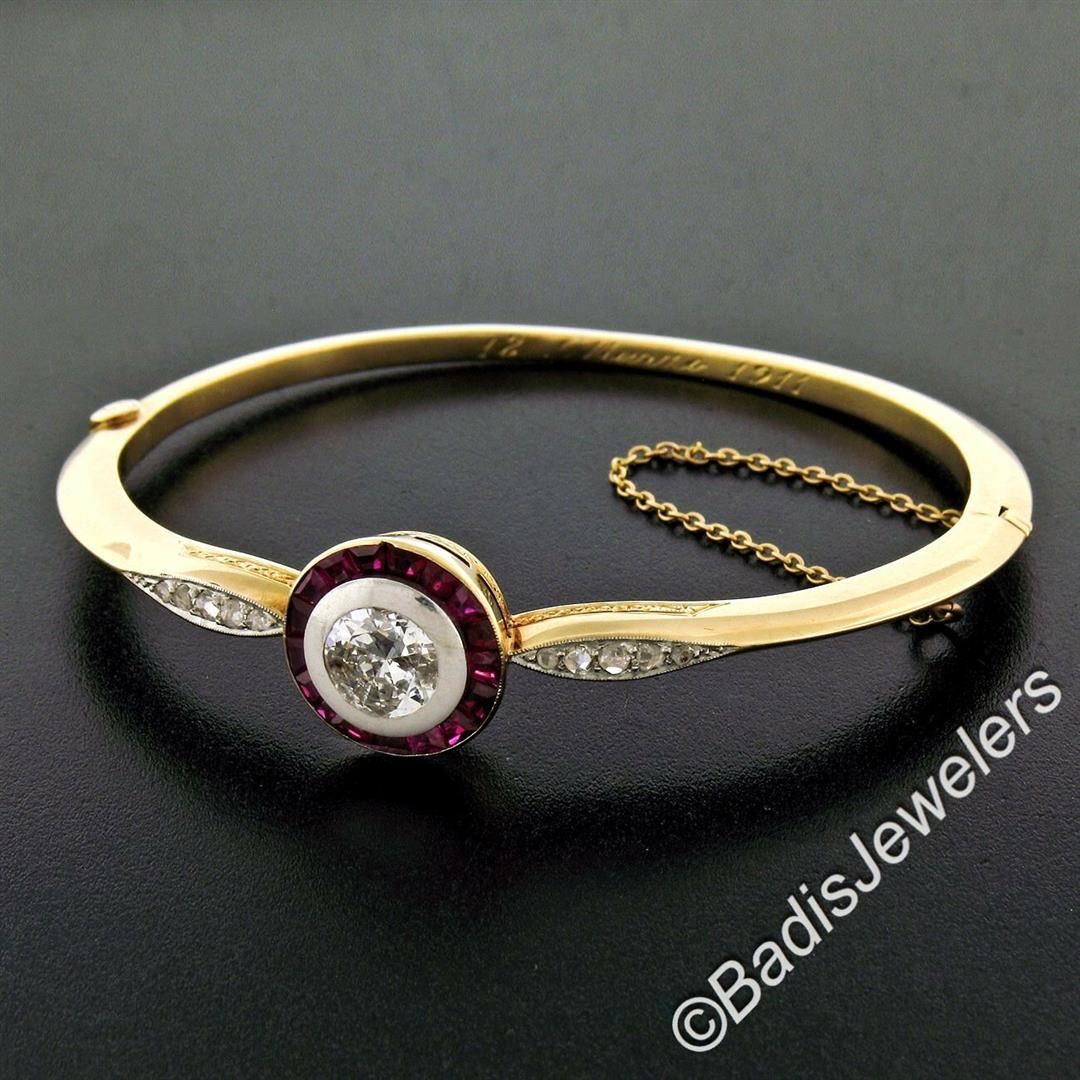 An Edwardian era 18kt yellow gold and platinum bangle bracelet with a 1.40ct old European cut diamond (H - I2) surrounded by a 0.85ctw calibre cut ruby halo and accented by 0.60ctw of rose cut diamonds (H/I - SI2). It weighs a total of 12.46 grams, measures 14.20mm wide, and measures 6.5 inches in length.