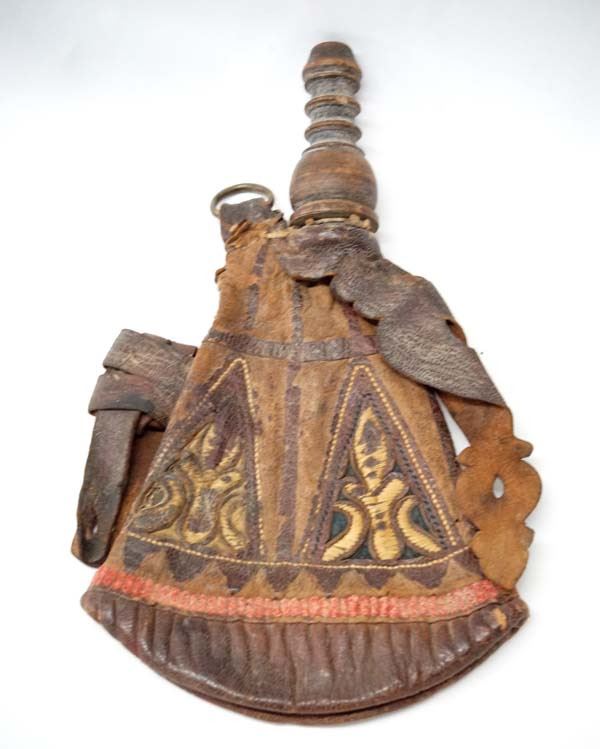 Antique 18th Century French Leather Hunting Pouch, Black Powder, measures 6'' x 10''L, has wooden spout with .5''D hole, spout measures 3''L, has leather holder for powderhorn, and metal ring to attach to belt, hand stitched embellishments