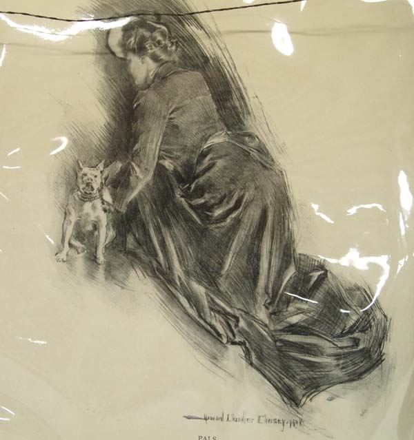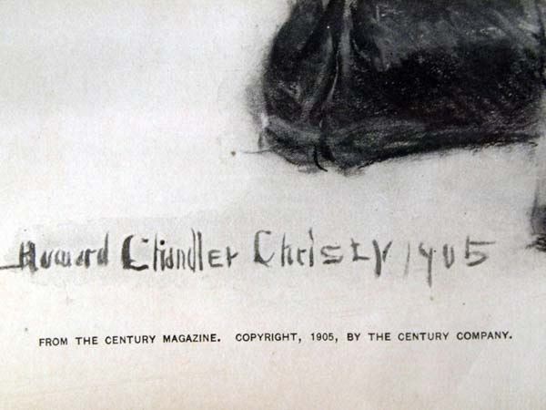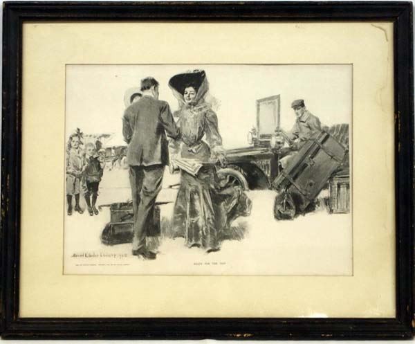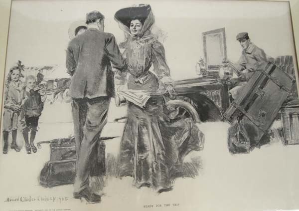 Antique 1905 ''Ready for the Trip'' Print, framed and under glass, visual measures 11'' x 15'', bottom of print reads ''Howard Chandler Christy 1905 From The Century Magazine, Copyright 1905, by The Century Company, Ready For The Trip'', some water damage on matting