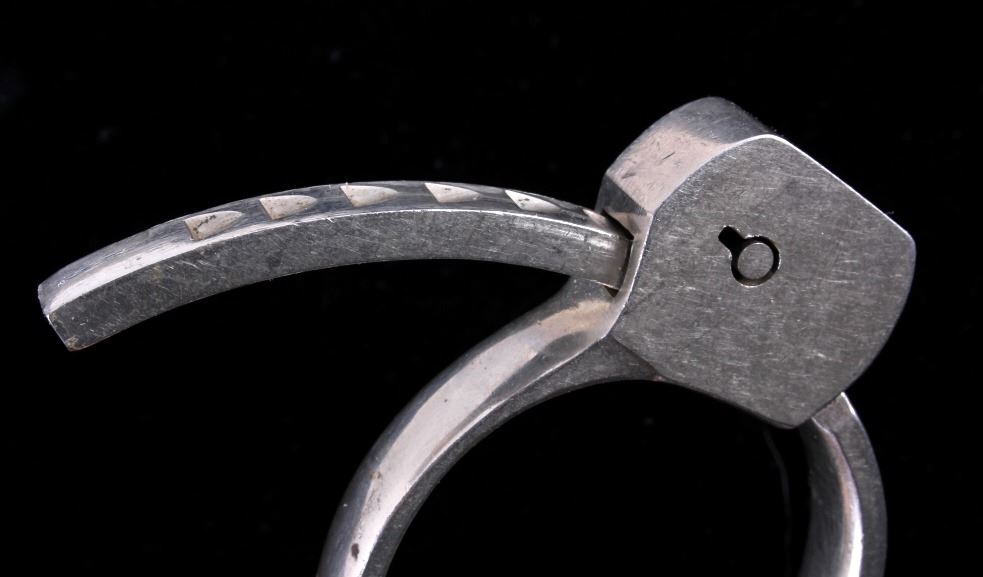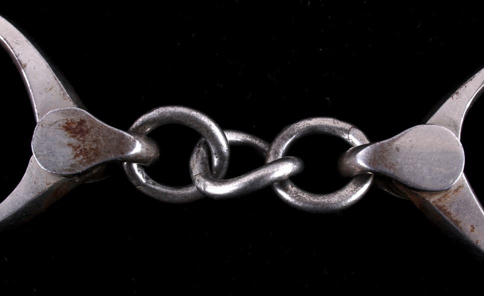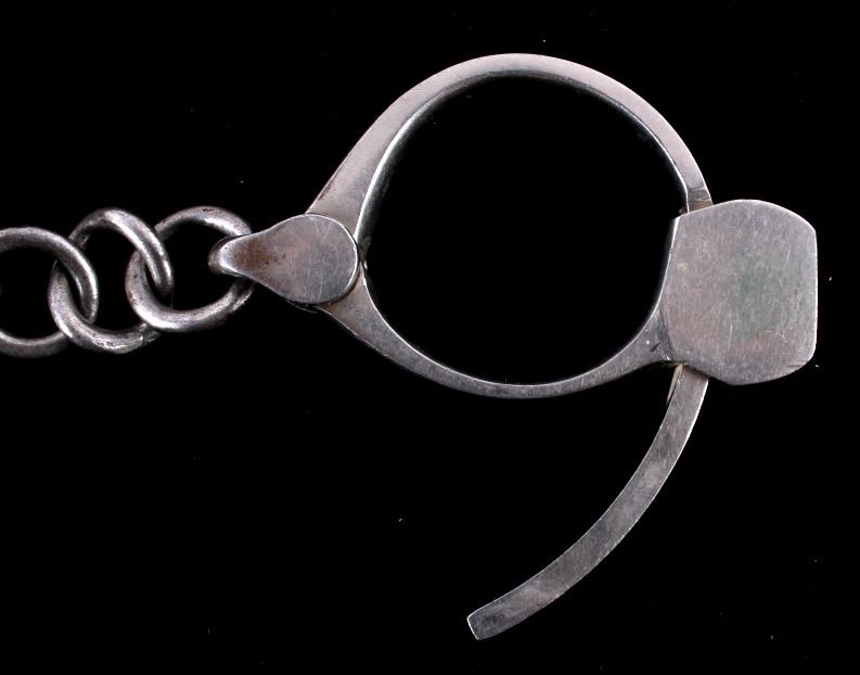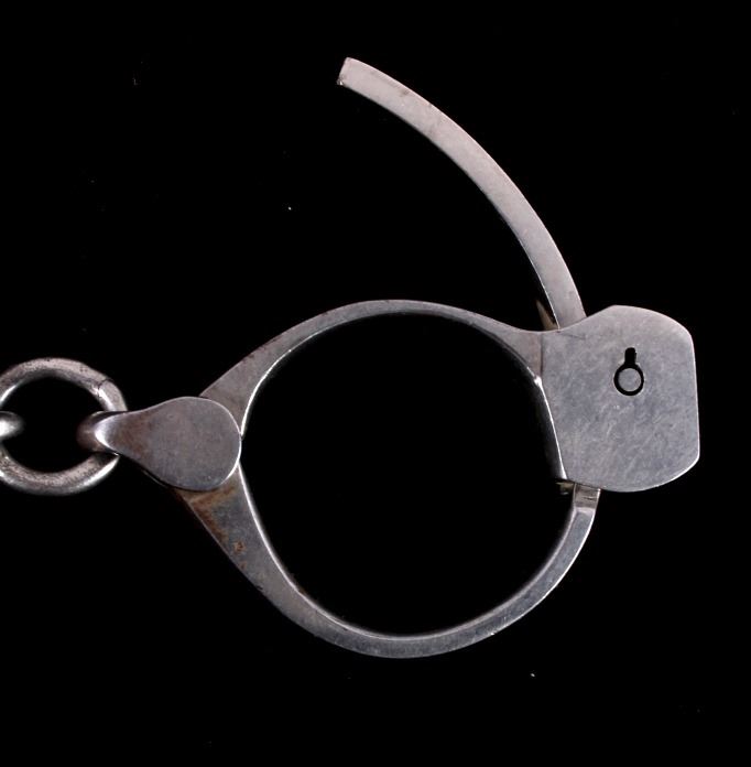 This is an antique pair of Tower's Detective handcuffs from the 1920's. These were advertised as lightweight, durable, and secure. The handcuffs are not marked and do not come with a key. The handcuffs are in good condition. They measure 3.5" x 9".