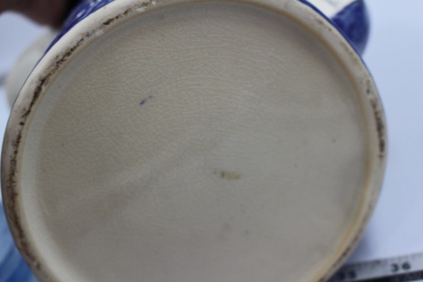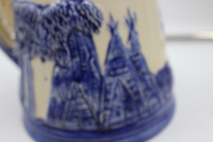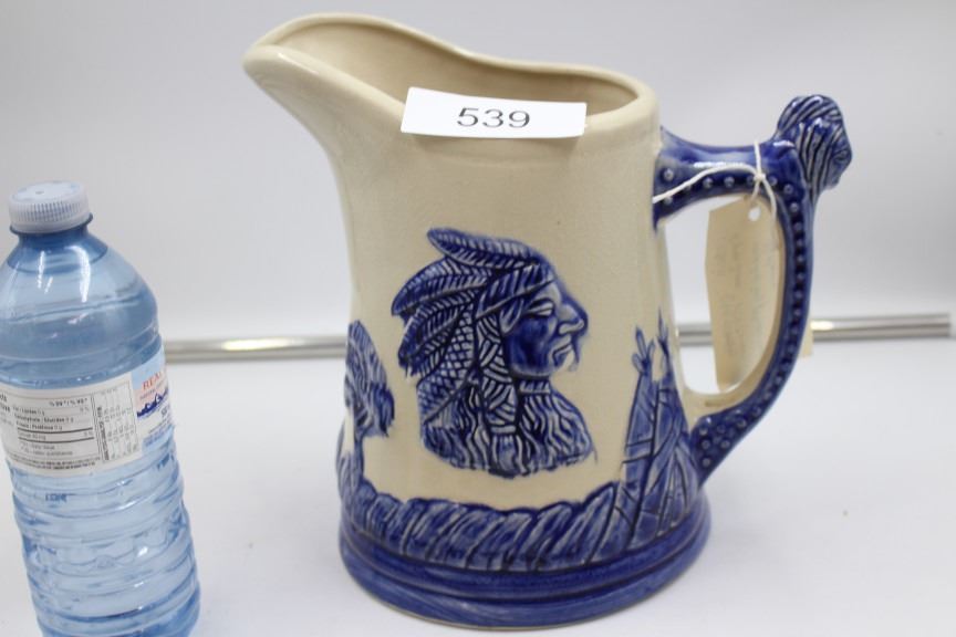 The pitchers typically feature a blue and white design with the chief’s head in the center, a tree to the left, and a teepee to the right1. They came in various sizes, ranging from 4 inches to 9 inches in height2.