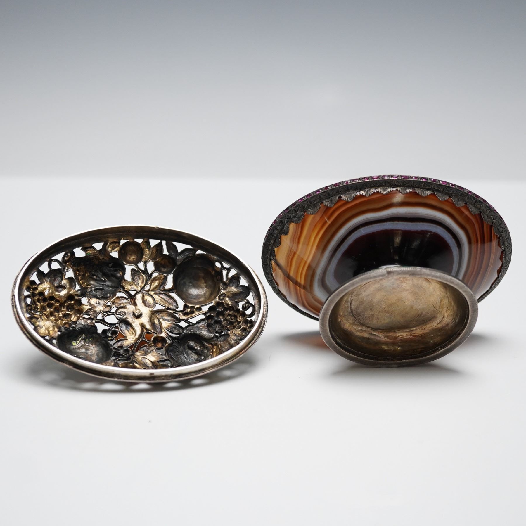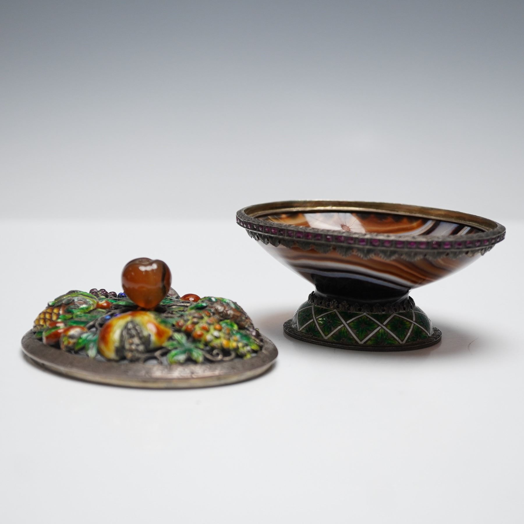 Antique 19th C Austrian Solid Silver, Enamel & Agate Lidded Dish