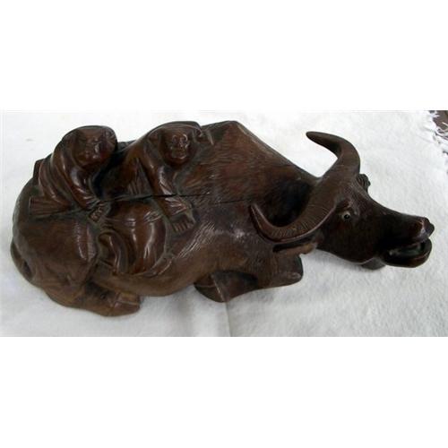 Bring the vibration of good fortune and confidence in to your life with the artisanship of this Outstandingly fine and unusually detailed hand carved allegorical water buffalo figurine with Holy Monks on his back. Made of Asian Walnut, the Monks are showing us how to harness the Natural forces of strength, good fortune, leadership, confidence, eloquence and fertility, represented by the water buffalo. Circa 1890. height 4 1/2" length 11" depth 5".