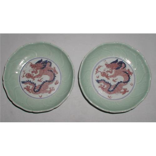 Very good antique pair of 19th C. Chinese blue and white with copper red against celadon ground, decorated with dragons in fine condition.