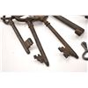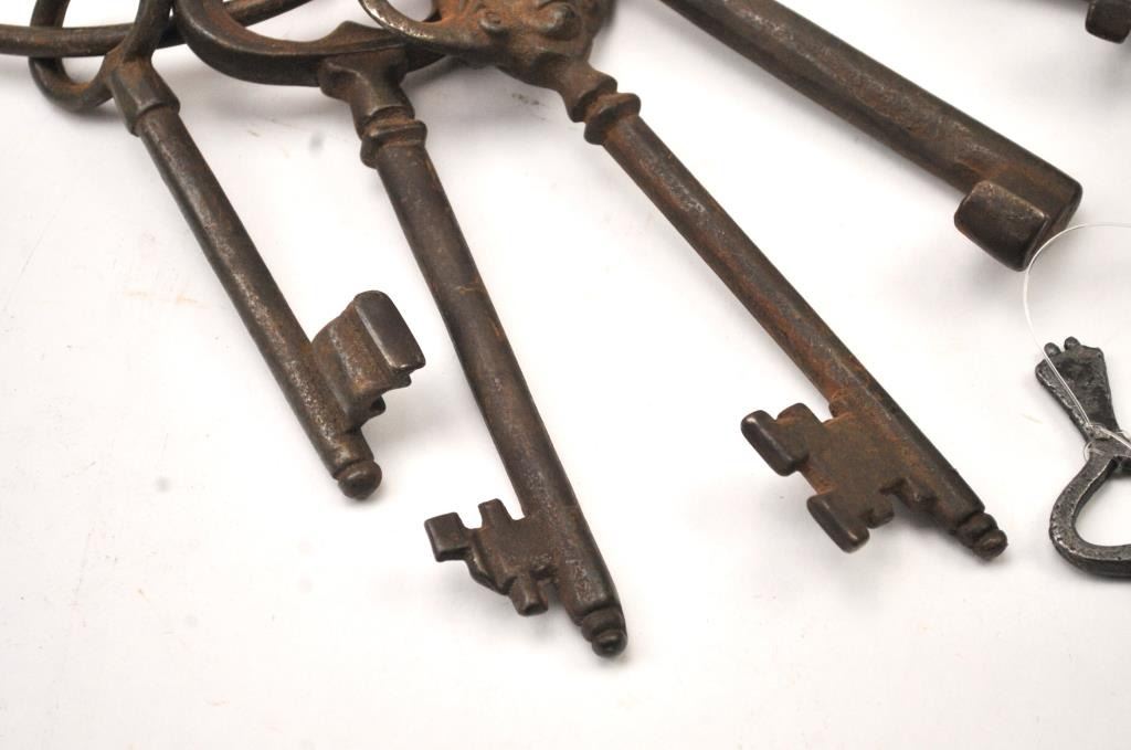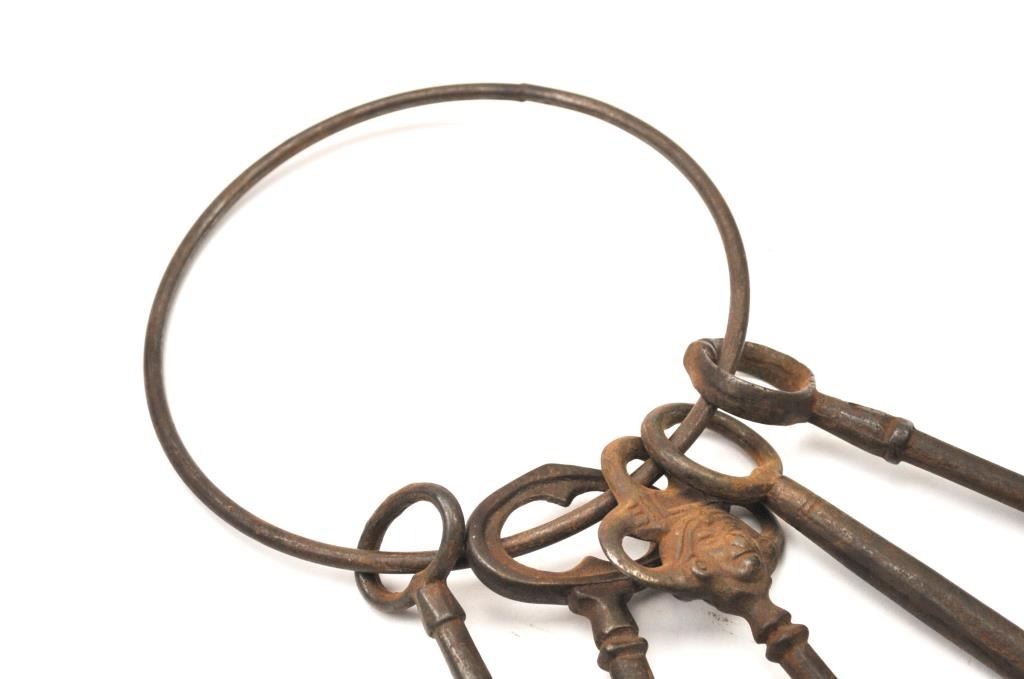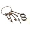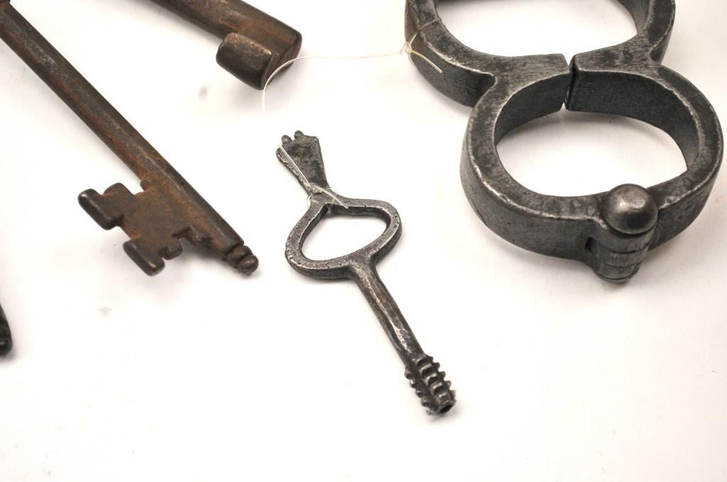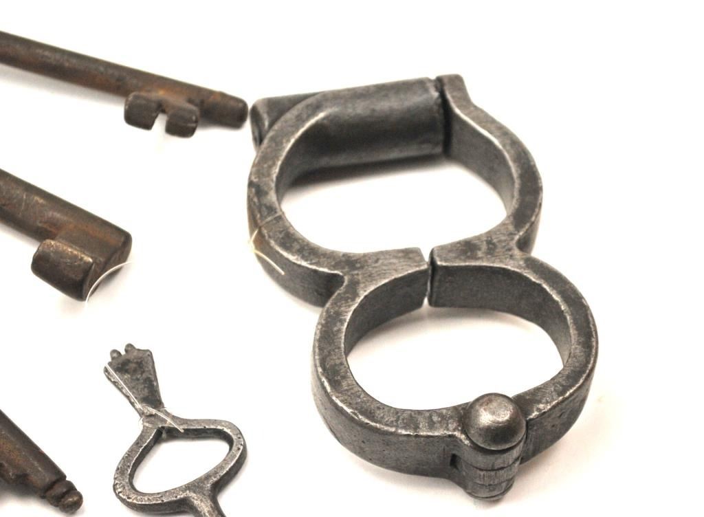 Antique 19th century set of hand cuffs with a screw style key. Additionally, the lot includes a large forged key ring with a jailer’s or grounds keepers type with five keys, circa 17th to 19th century handmade and fancy. Est.: $175-$350.