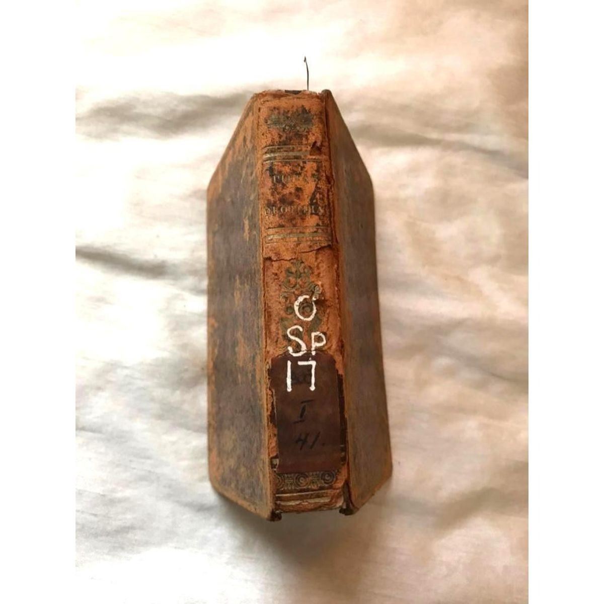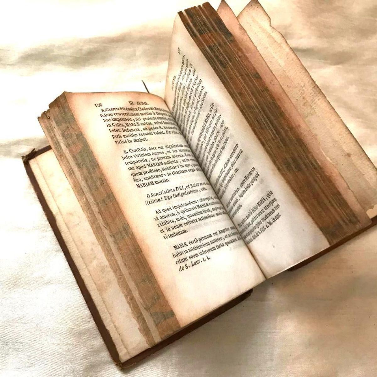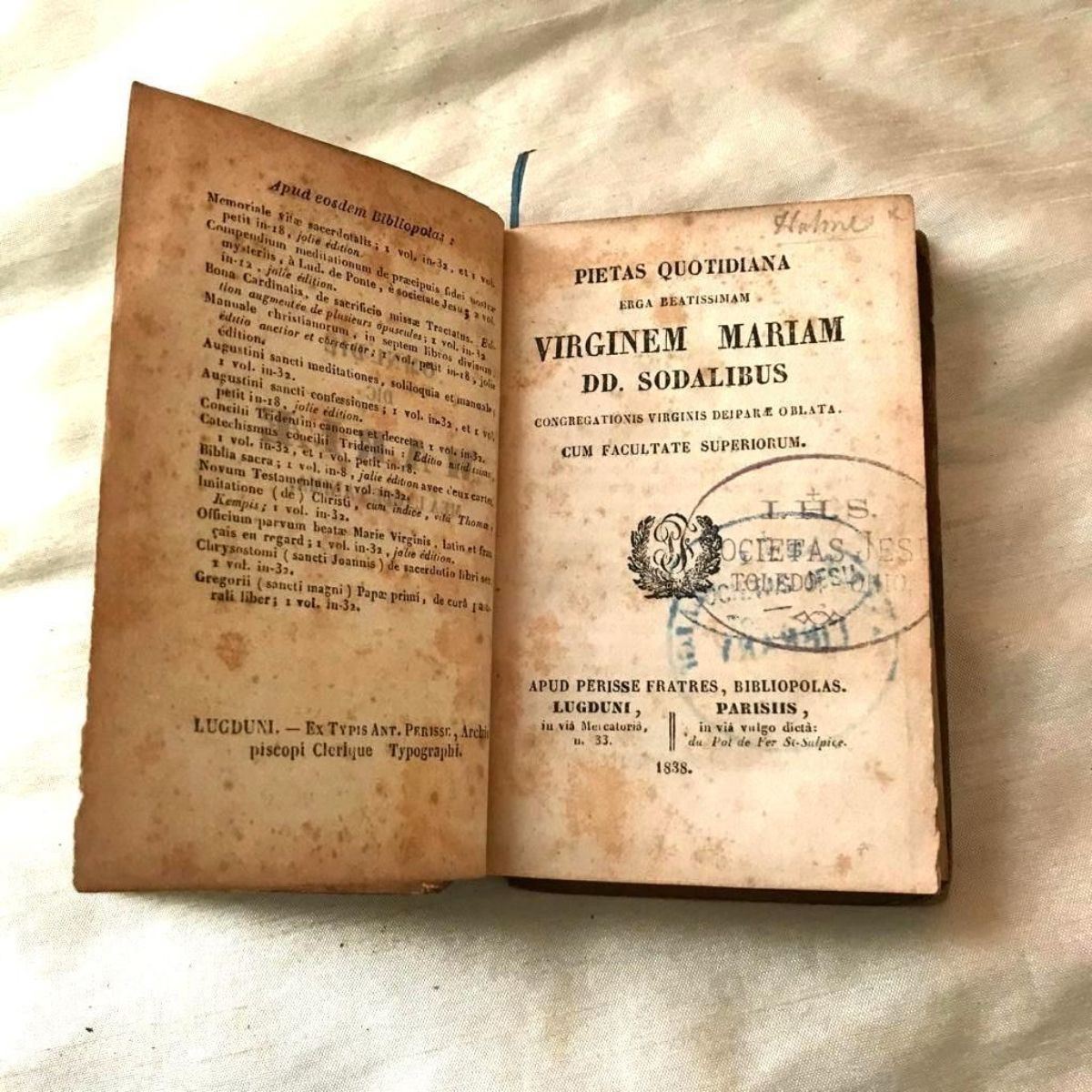 Small, pocket-sized book of religious quotations, Pieta Quotidiana dated 1838. Pietas Quotidiana, Erga Beatissimam, Virginem Mariam DD. Sodalibus. 3" X 4 1/2" leather bound, 367 pages. ** Book has library catalog # in white on spine, a stamp from the West Baden College Libary on inside cover page, as well as a stamp from I.H.S. Societas Jesu in Toledo, some handwriting in pencil, library card holder affixed to inside back cover, typical foxing for age. Â