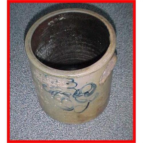 This Two Gallon stoneware crock is 9-1/2" tall. Applied pulled side handles with brown glaze inside. The only markings that I can find is the cobalt decoration. The "2" is surround by a cloud-like brushstroke and looks-like initials underneath the "2". Fair condition with inside chip, chipped pulled side handle, tight hairline near handle and uneven coloring. I found this in a Midwestern barn several years ago.