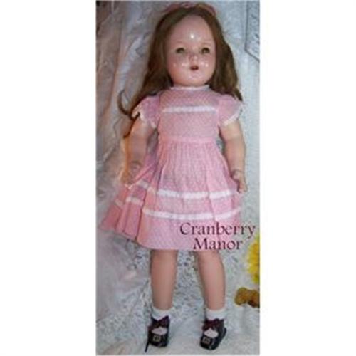 * this absolutely spectacular dolls comes to you in composition w/real human hair - she is wearing a vintage, pink gingham dress, possibly from the 50s, but retains her original shoes and socks - she is sleepy eyed and jointed and just fabulous