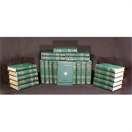 This is a fine set of the Works by Charles Dickens. There are 25 volumes here consisting of: Mutual Friends 2 volumes, nd; Martin Chuzzlewit 2 volumes, 1888; Nicholas Nickleby 2 volumes, nd; David Copperfield 2 volumes, nd; Little Dorrit 2 volumes, 1889; Dombey & Sons 2 volumes, 1889; Barnaby Rude 2 volumes, nd; Curiosity Shop 2 volumes, nd; American Notes, nd; Great Expectations, nd; A Tale of Two Cities, 1875; Christmas Stories, 1889; Christmas Books (including the Christmas Carol), nd; History of England, nd; Edwin Drood, nd; Sketches of Boz, nd; and Oliver Twist, nd. WOW! Incredible collection and a must have for any literary collector! The books are all bound in rich sage green buckram (cloth) over boards with gold gilt and black décor on the cover and spine. They are part of the Standard Edition published by Chapman & Hall Limited: London. Each book has numerous illustrations with some tissue guarded plate illustration including a frontispiece. They have a great look! They are stunning and sophisticated when lined up on the shelf ? not to mention the incredible stories told within their pages. They are in very good condition. They have some shelf wear to the head and tail of the spine and a few have some scuffing and rubbing here and there but all in all very very good. They are 8vo in size measuring 9?h (there thickness varies depending on the length of the stories).
