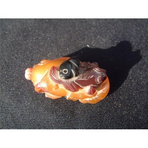 Antique 3 colors amber snuff bottle with a black and red fish design. The background is of honey-cream color and carved with flowers and vines in relief. Length: 2.4" (6 cm.).