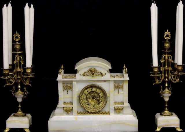 in white onyx by Ansonia, onyx panels on clock show some repairs, non working with open escapement movement. Frawley Estate item. Est. 250-500