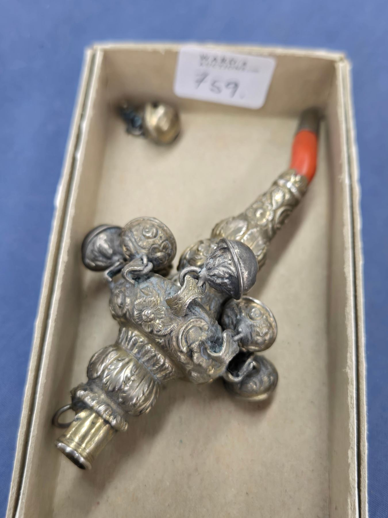 Antique 4 1/2" baby rattle, note: one detached bell, included and silverplate worn down to brass
