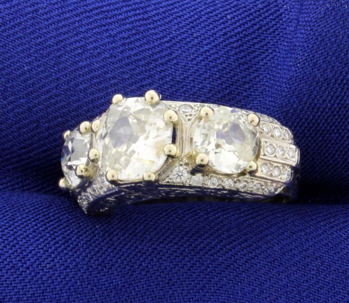 Three old style cut diamonds, center is 2ct, side diamonds are 1ct each. Diamonds are SI clarity, M color surrounded by 1/2ct TW of diamonds. Platinum mounting, size 6 1/2. 10.1g