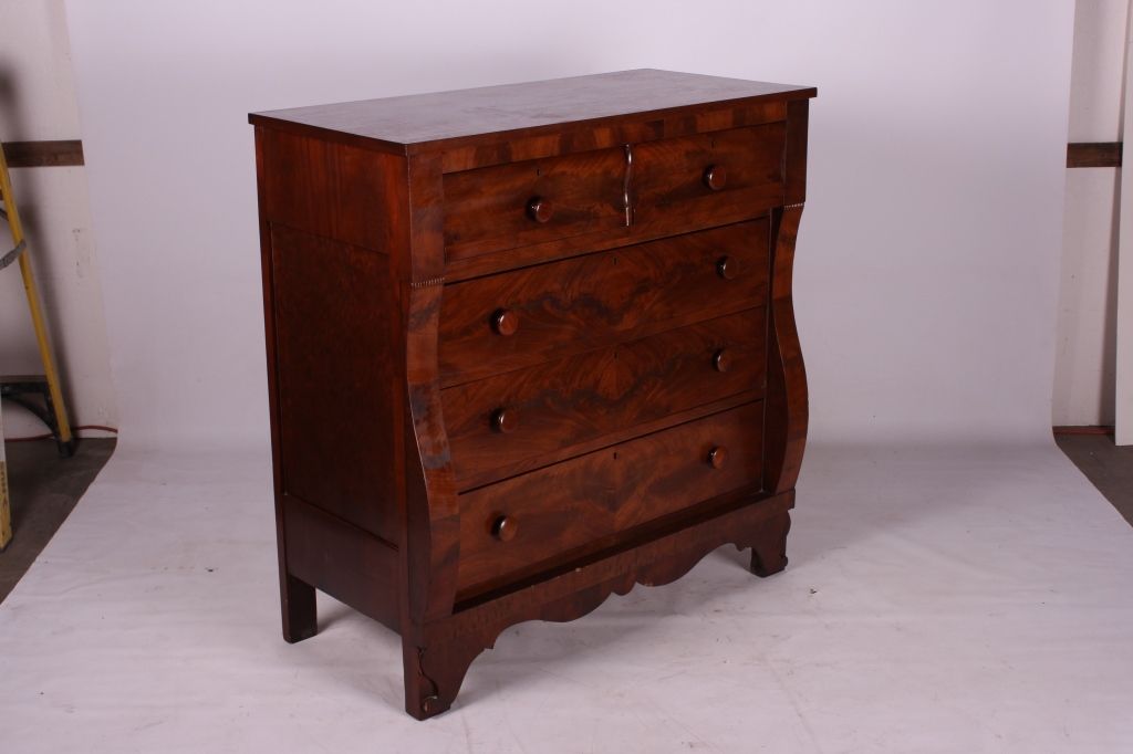 This is an antique 5 drawer dresser. The two top drawers of the dresser have a curved front. The other three drawers are large and spacious. The dresser is in good condition. It measures 43" wide, 21" deep and 44.5" tall.