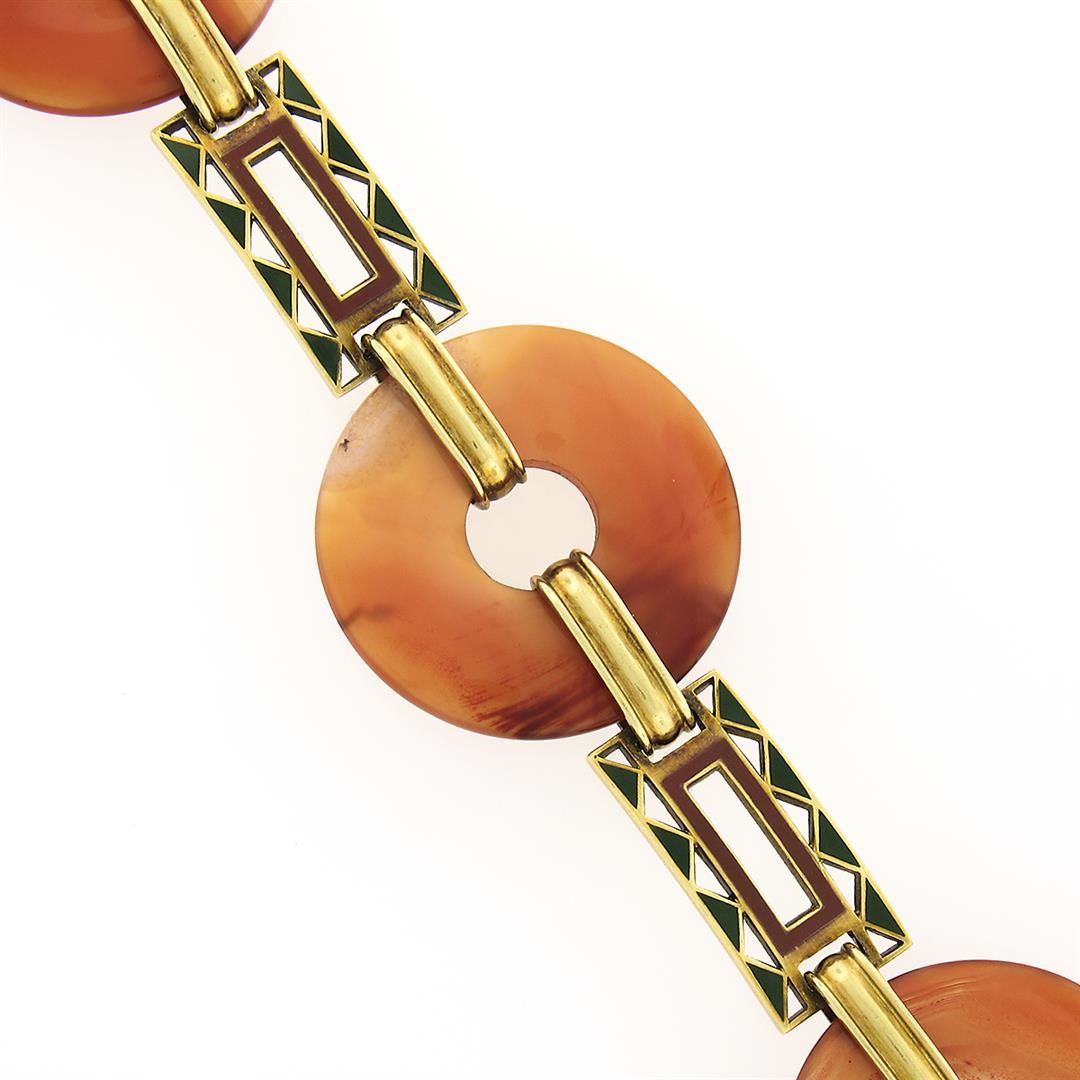An antique solid 14k yellow gold link bracelet, with 3 pierced round cabochon cut natural agate (24.5mm, 25mm & 26mm) & enamel work. It weighs a total of 26.26 grams, measures 25mm wide, and measures 6.5 inches in length.