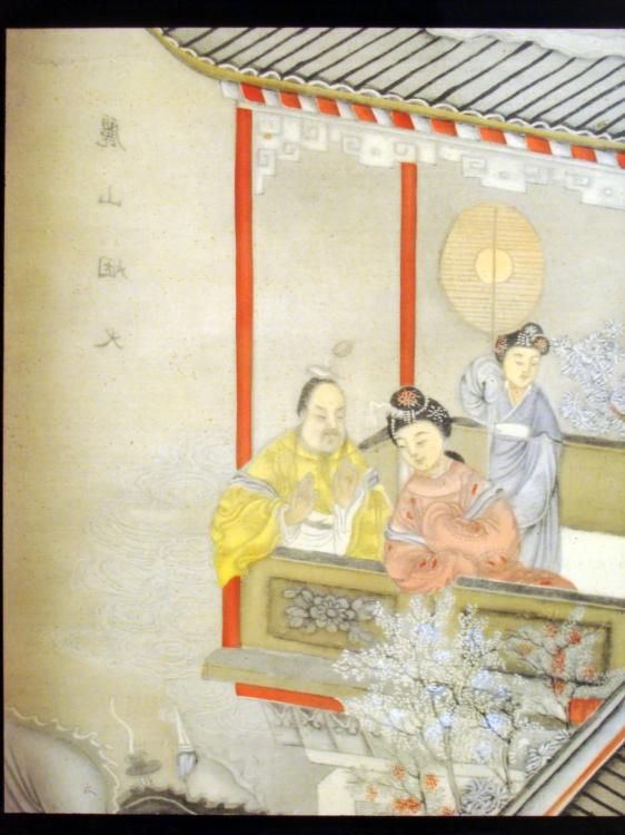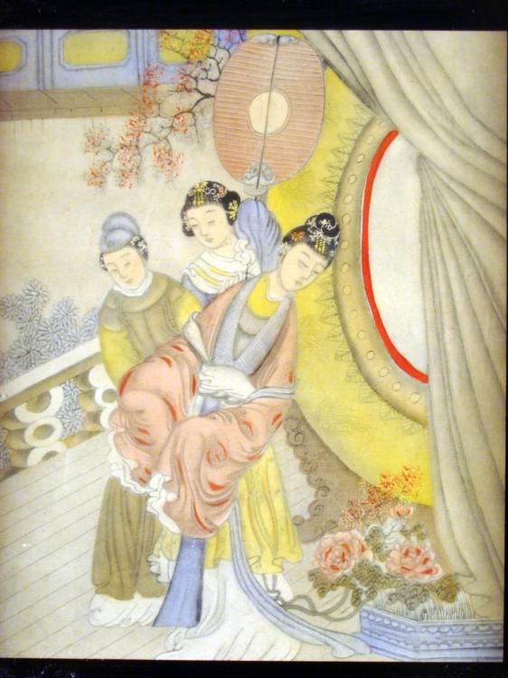 This is a series of 6 individual Chinese paintings all in one elaborate presentation. They date back 100 years or more. The paintings portray beautiful women of the old days, wearing elegant gowns and jewels in their hair. Two of them have sentences in Chinese characters. One translates as "the sound of flower in the small building." The other is "the sound of the jade XIAO is far away." (XIAO is an old Chinese instrument). Both these lines are from old Chinese poems. The beauty of the scenes is matched by the ornate frame. Each section has inner borders in red weave pattern, with beaded outer portion in gold. The rest is black, with natural wood grain pattern, and gold painted ornamentation. Medium: Watercolor and ink on paper or silkImage size: Each painting is 8 1/2 x 10 1/2 inchesFraming: In wood frame painted red, black and gold, with cut-through designsFrame size: 44 x 36 1/2 inchesConditions: Paintings are excellent; frame has chips, and crack on top center decoration
