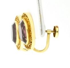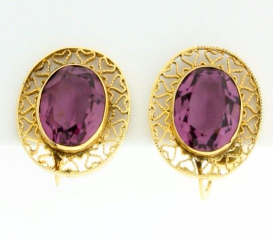 These 14K yellow gold earrings have beautiful filigree, and each earring contains a 10x8mm oval amethyst gemstone with excellent color and clarity. They are 5/8 inch long. 3.1g