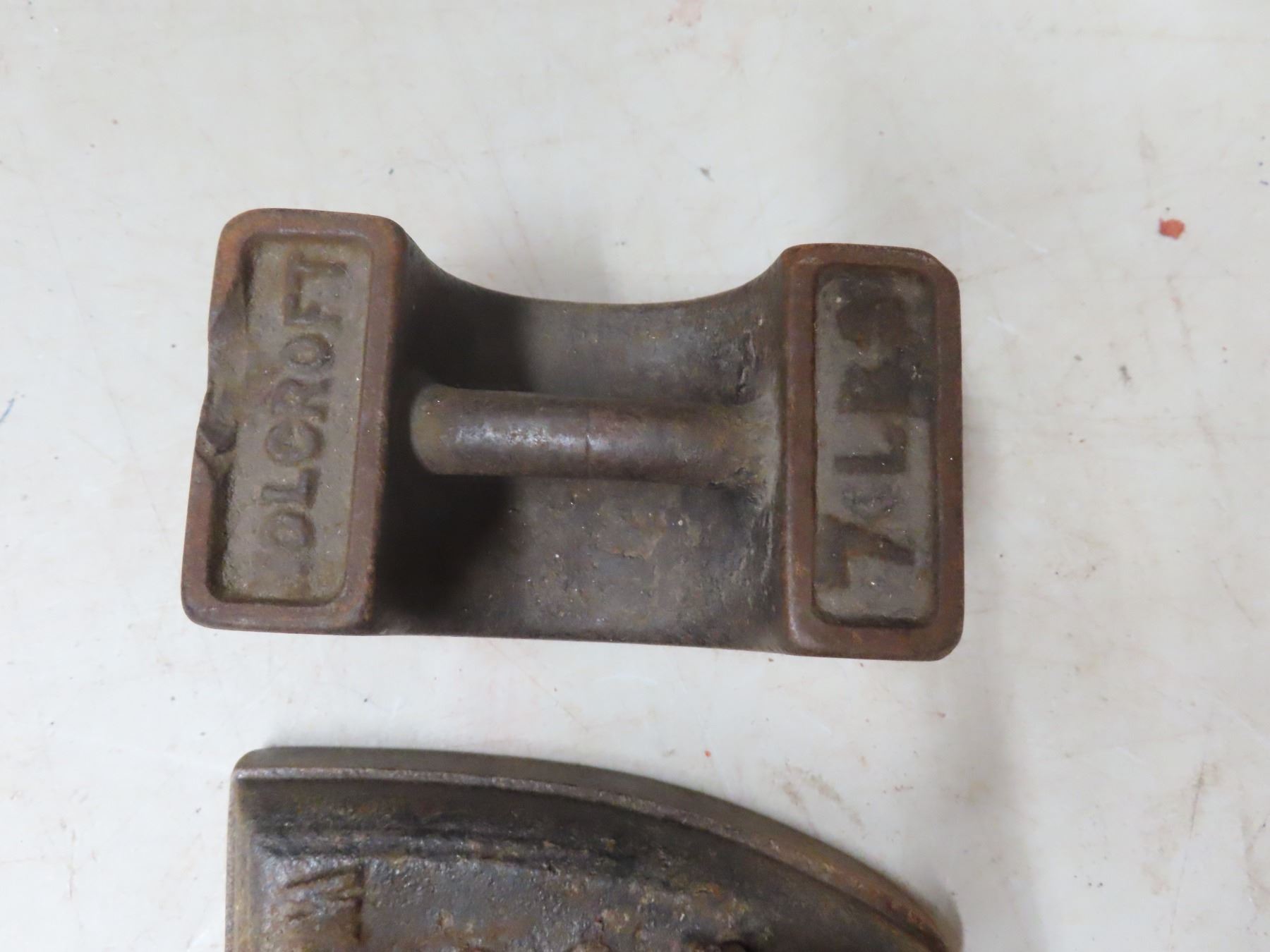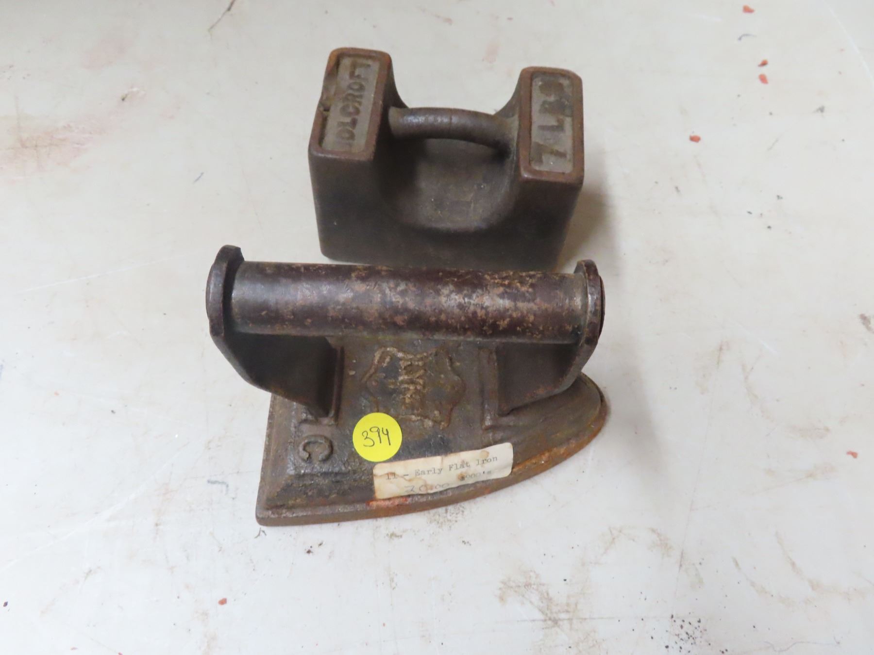 Antique 7" cast iron sad iron and 7 LB platform scale test weight