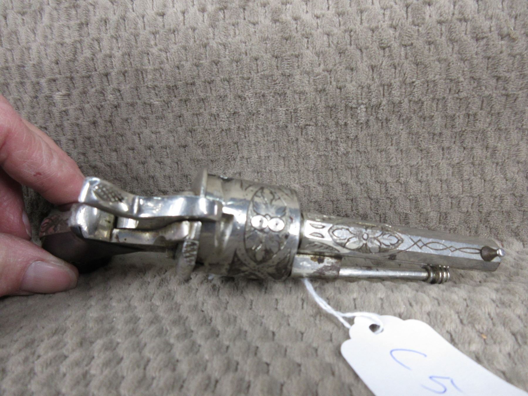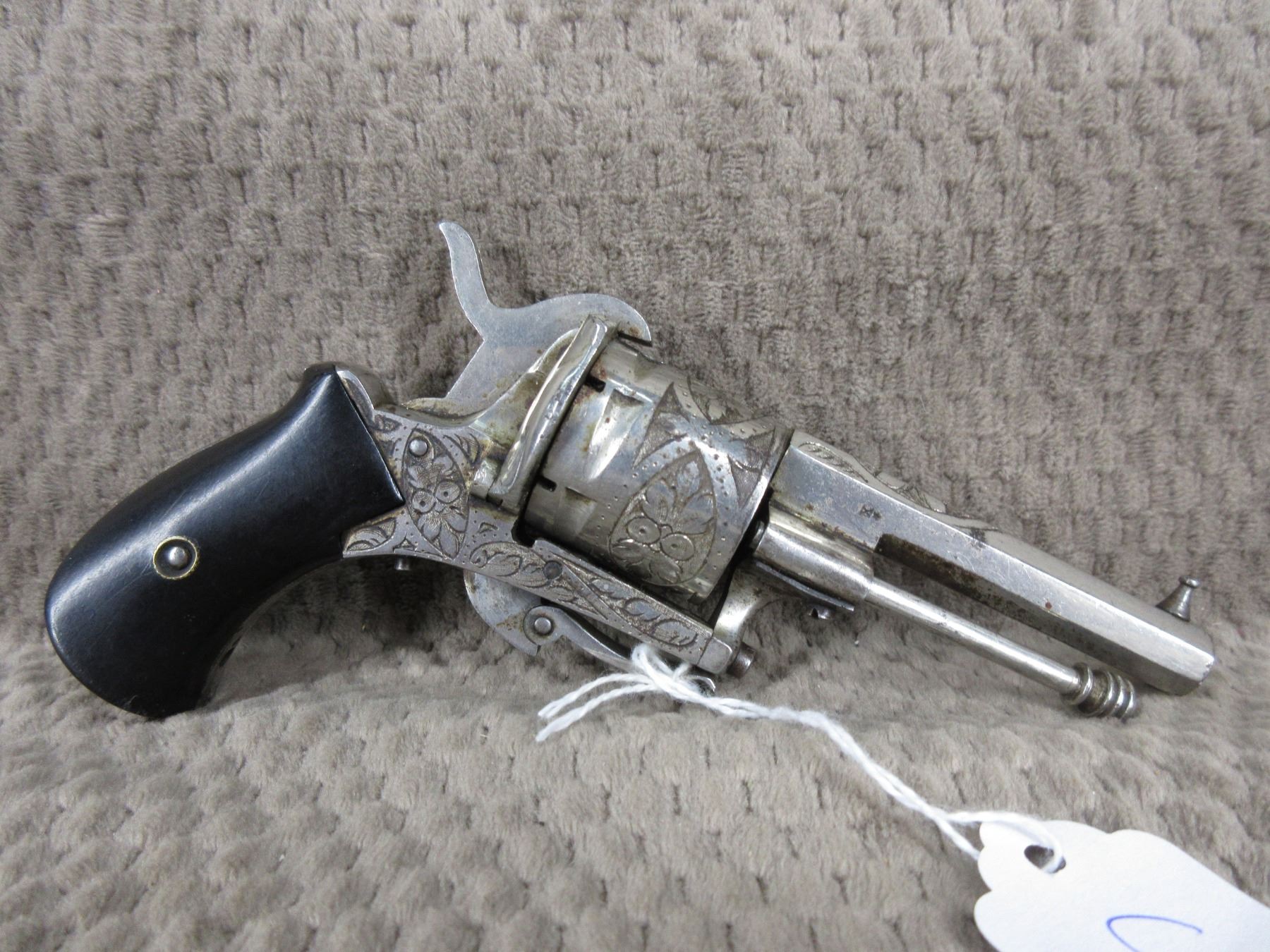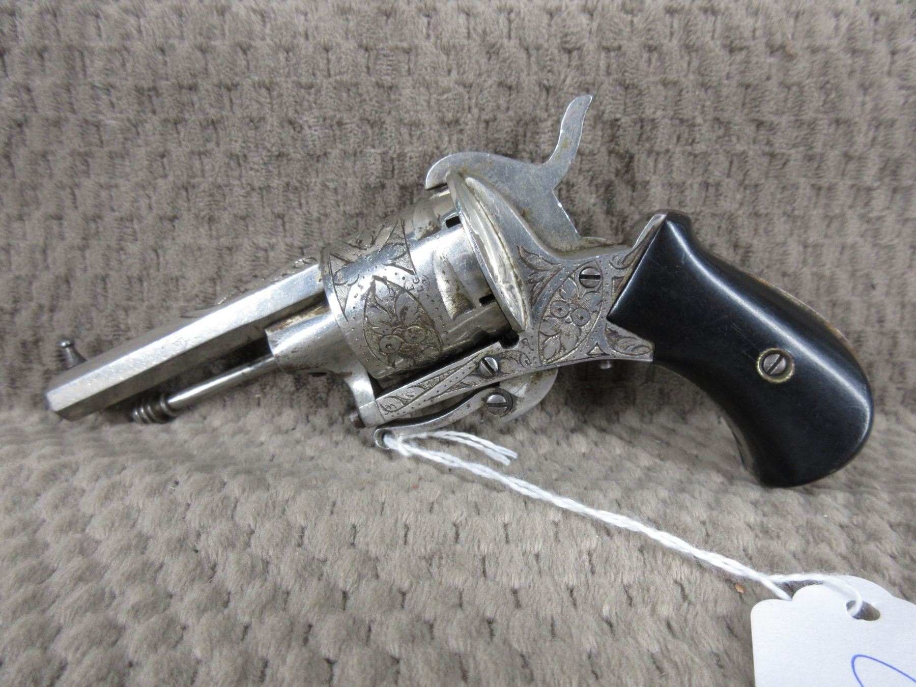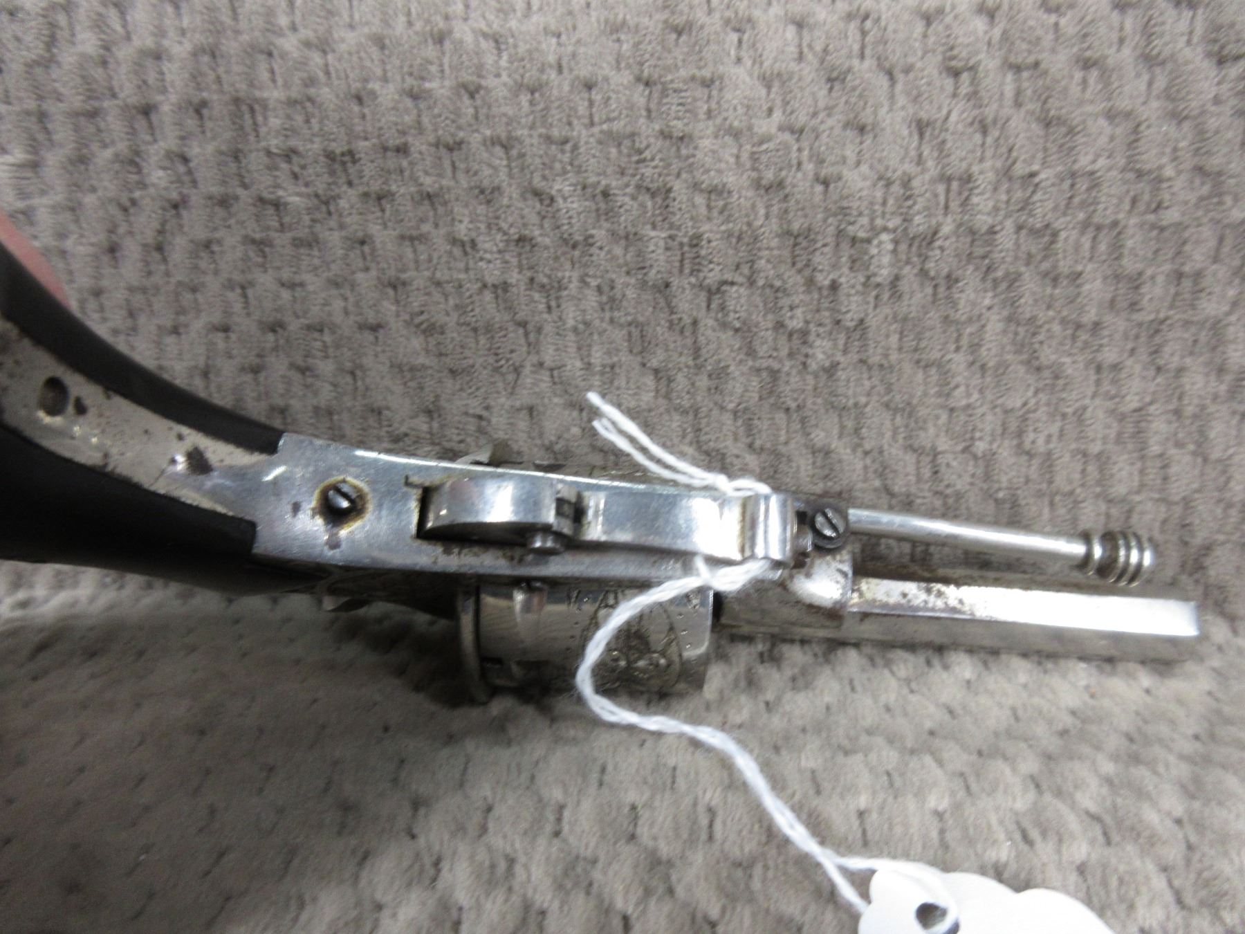 Antique - 7MM Pinfire Revolver Flip Up Trigger - This 6 shot pistol appears to be in working order but needs cleaning as is sticky. Barrel is 2 3/4", nickel plating is good, has rifling but hard to see without taking gun apart, fixed sights, grip appears good and original.