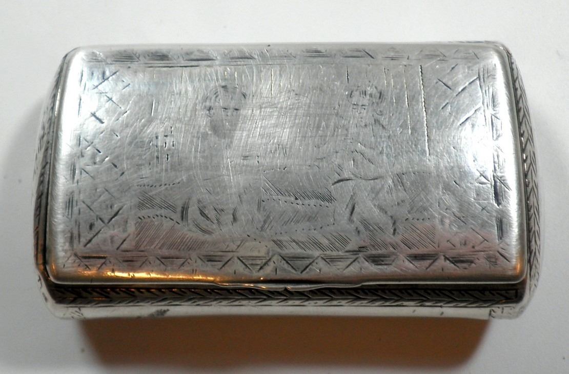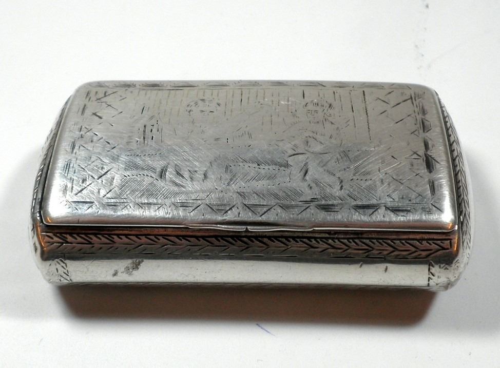 Antique 84 silver box, with hand-carved embellishments, two angels (?) on the cover, - carvings are corroded, gilt interior. Flaws: dent in bottom and dents in left side, tear. Signed and dated 1819, weight: 54.7 gm, dimensions: 8X4.5X2 cm.