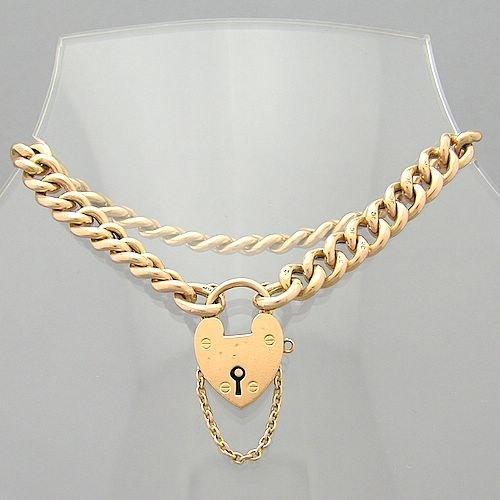 Antique 9 kt. pink gold lady's curb link bracelet, circa 1895. The bracelet measures 7.75 in. (Length) x 0.25 in. (width). This is a plain and polished curb link type. The clasp is a heart shape lock type which has a side sleeve opening and is fitted with a safety chain. Each of the links and the lock are stamped 9 c. This type of bracelet was considered a lover's design because of the heart lock and is fashionable even today. Measurements: 7.75 in. (Length) x 0.25 in. (Width) | Weight: 12.7 grams | Marks: 9 c , Maker's Mark LW&C