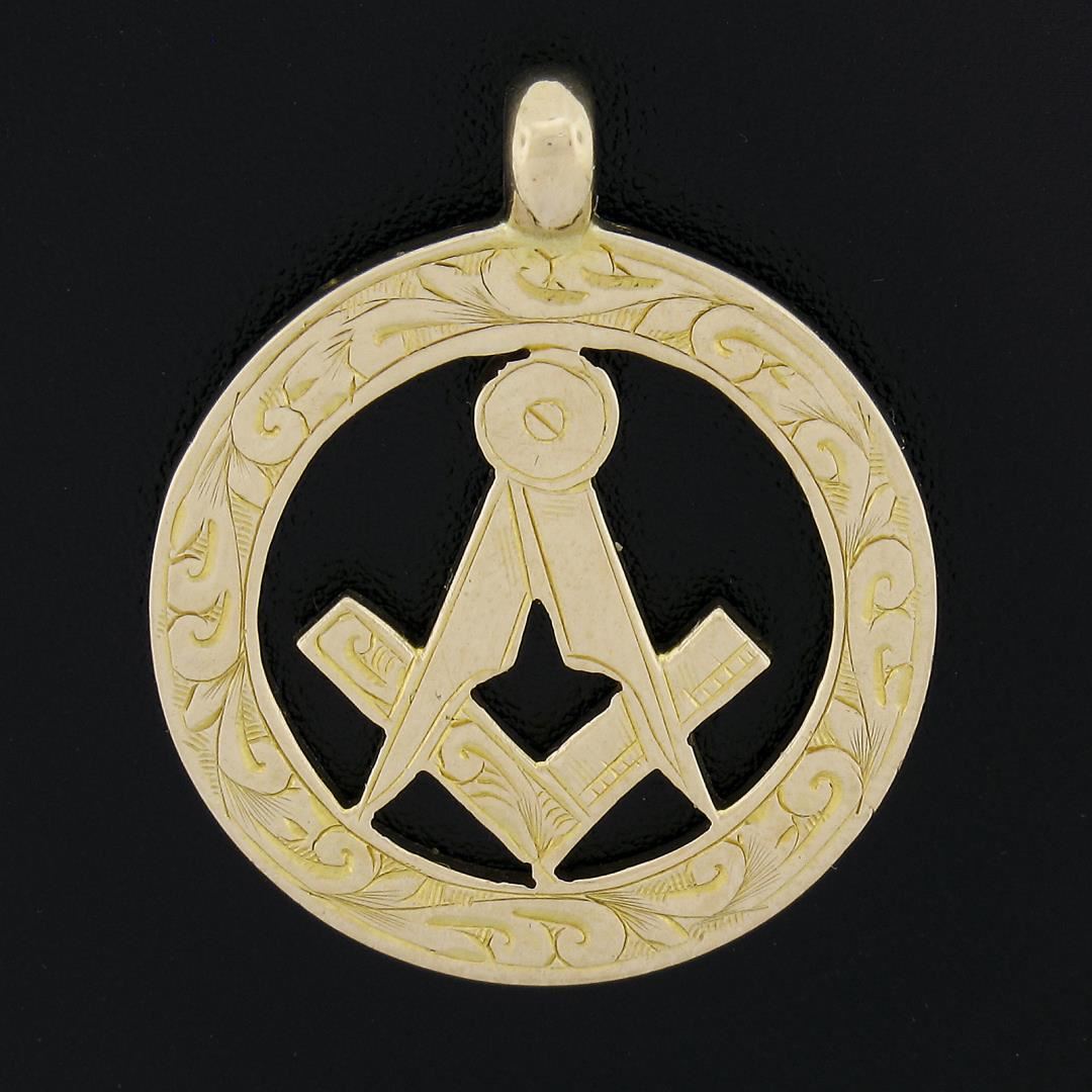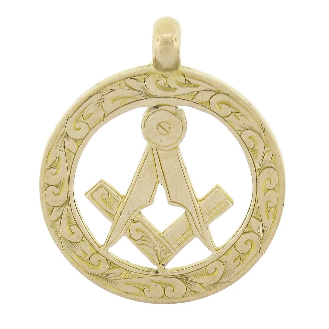 An antique solid 9k yellow gold masonic pendnat. The pendant weighs a total of 5.59 grams, measures 28.6x23.7mm including the bail, and the inside of the bail measures 2.5mm.