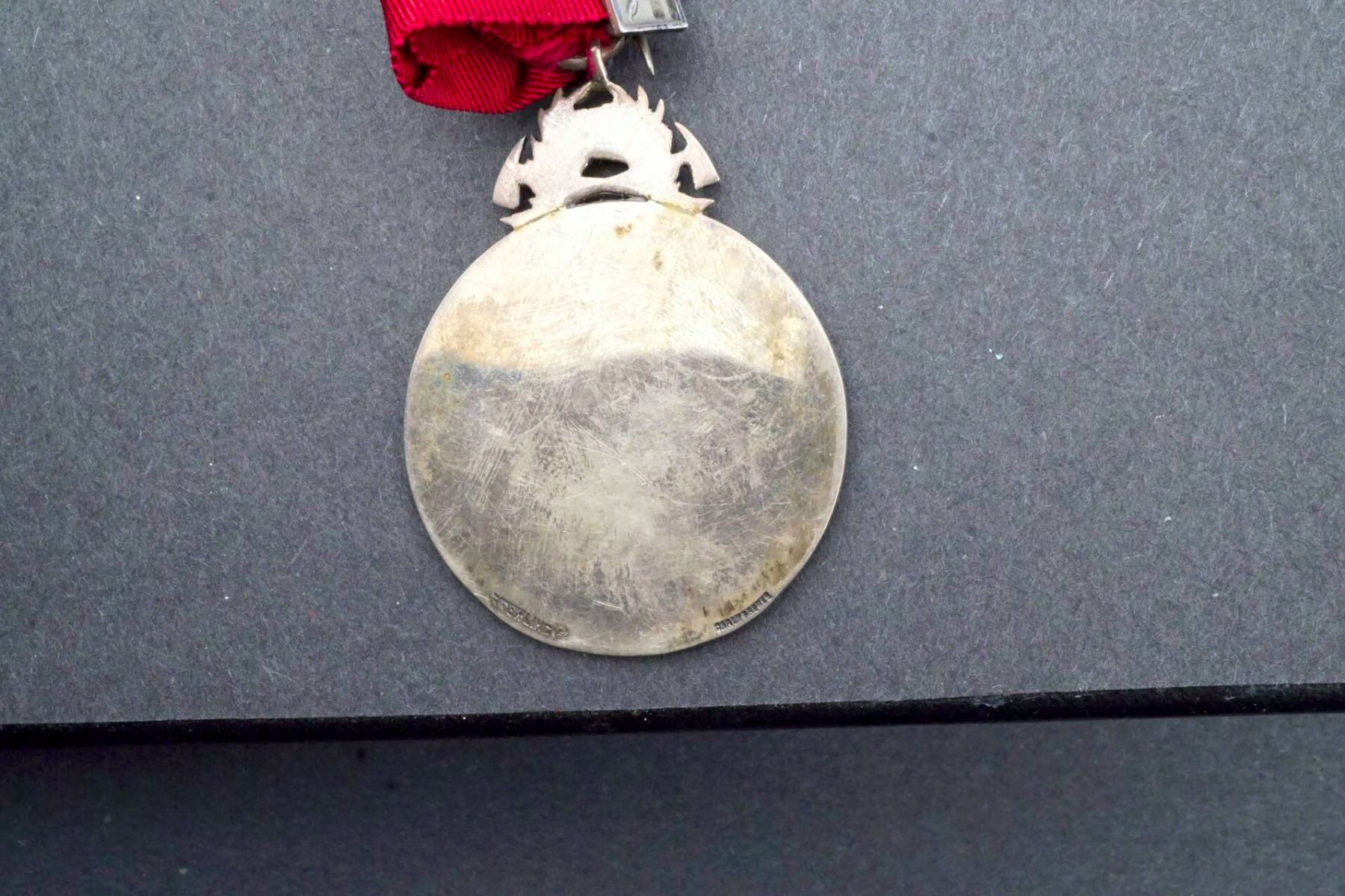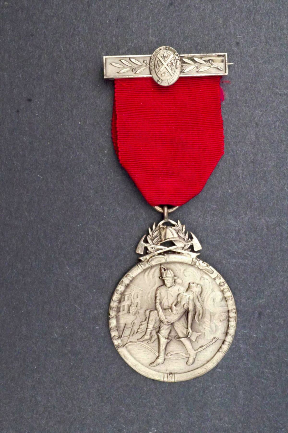 Reverse is blank, only stamped Sterling and the maker's mark: CARON FRERES. The obverse text is in English to left, French to right: FOR VALOUR / POUR VALEUR. Obverse depicts a fireman carrying a rescued woman, antique firetruck in the background above and attached to the ribbon, a fireman's hat in a wreath, two crossed axes below.The clasp depicts the arms of the city of Montréal. A handsome piece. 40 mm, 28.4 grams total weight.