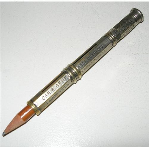 I would date this interesting piece of social history and unusual advertising collectible to the early 20th century, maybe even Edwardian.<p>The case is made from a nickel or chromium plated brass with the brass showing through in a few places from use over the years.<p>What makes this particularly special is the perpetual calendar integrated into the end of the propelling pencil. The numbers are turned to correspond with the appropriate day of the week, making this truly "perpetual" and indeed, can still be used today.<p>There is a ring around the shaft of the case which when pushed up the shaft pushes the pencil out and into use.<p>This pencil was clearly an early advertising give-away for a British Insurance Company as the engraving shows: Car & General Insce Corp. Ltd / 1 Queen Victoria Street London E.C./ Capital GBP 250000, 30 Branch Offices, Income GBP175000.<p>A great addition to your collection in very good condition. Measures 4" long when closed.