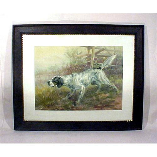 This is an absolutely wonderful and colorful advertising lithograph. On the very bottom left hand corner it reads: Copyright 1907 BY E. I. DU PONT DE NEMOURS POWDER CO. Above that also on the lower left hand corner it is entitled: Joe Cumming by Antonio Picciola 1899. It is signed on the lower right: Edm. H. Osthaus. It is a super advertising item from the Powder Company. There is also an F in fancy script within a circle with the word FORBES below that. The lithograph is in nice condition with only a little bit of acid burning towards the very top of the matt. It is housed in an oak frame, which is very dark in color with a beaded brass molding all the way around. It is in a perfect large size measuring 32 ¾? x 26 5/8? overall and the sight size is 27 ½? x 21 ½?. For any of you who collect advertising items or spaniel dogs this is a must have! The colors are so naturalistic and vivid ? the detail is intricate and very well executed.