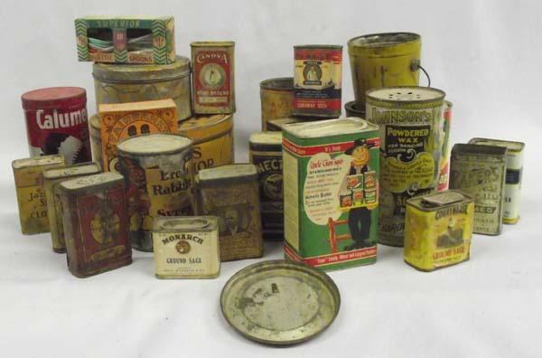 Vintage Tins, Spoons, Gold Dust Washing Soap Box. Spices, waxes and food cans with original labels. Some still have spices inside. Largest is 7.25'' diameter, 3'' Tall. Buyers Pay Actual Shipping and Handling Charges(see terms and conditions for more information).