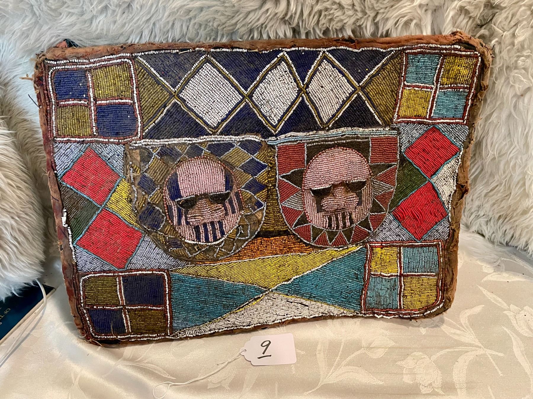 An antique African beadwork offered in the auction is a meticulously crafted piece adorned with vibrant, intricately arranged beads that showcase traditional artistry and cultural heritage.