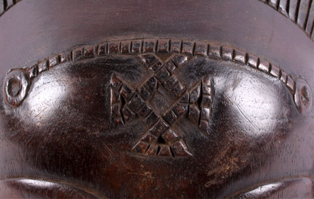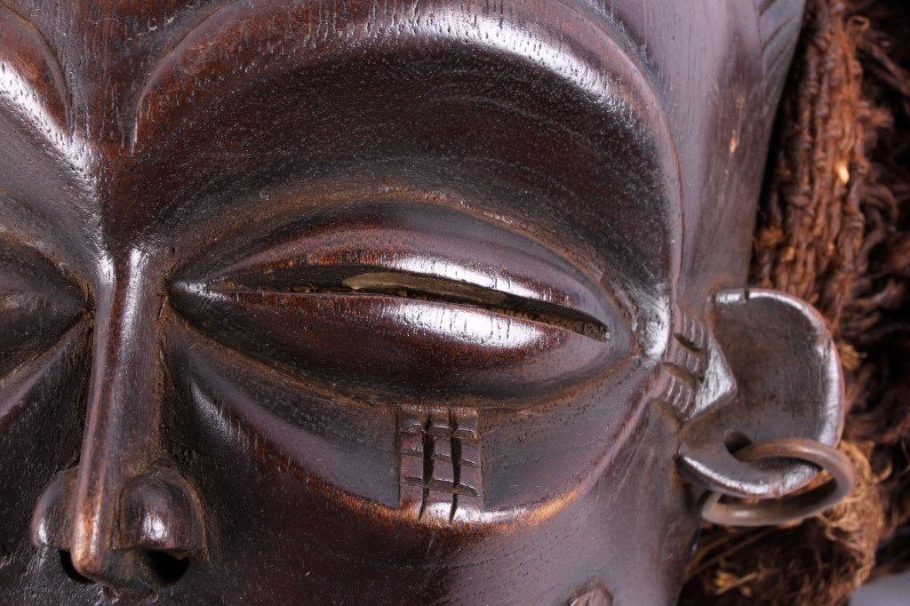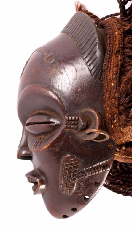This lot features an African Dan mask with braided hair. The Pende mask. It is hand carved and in good condition. The mask shows brass trade earrings. The mask has impressive carvings showing excellet quality. The Danmask measures 9"x9"x10"