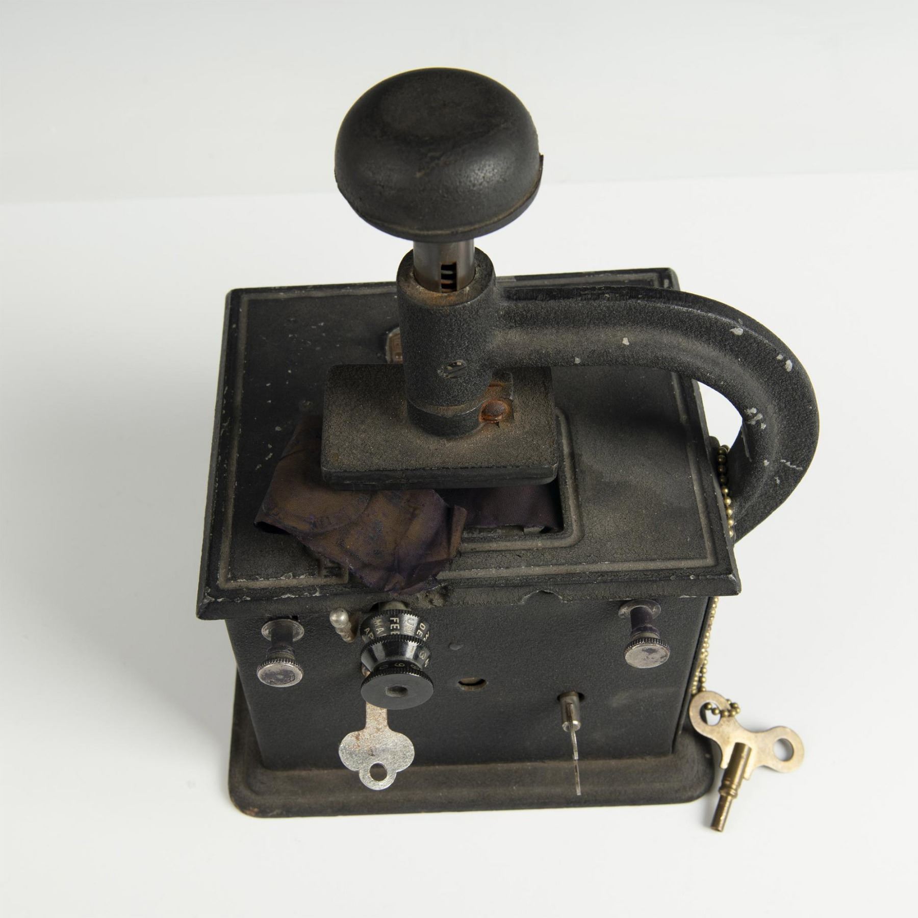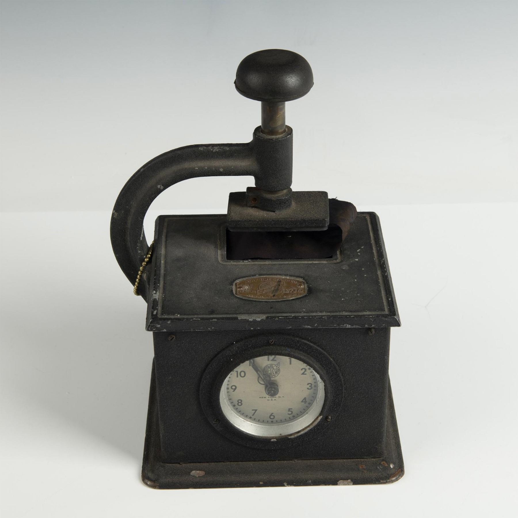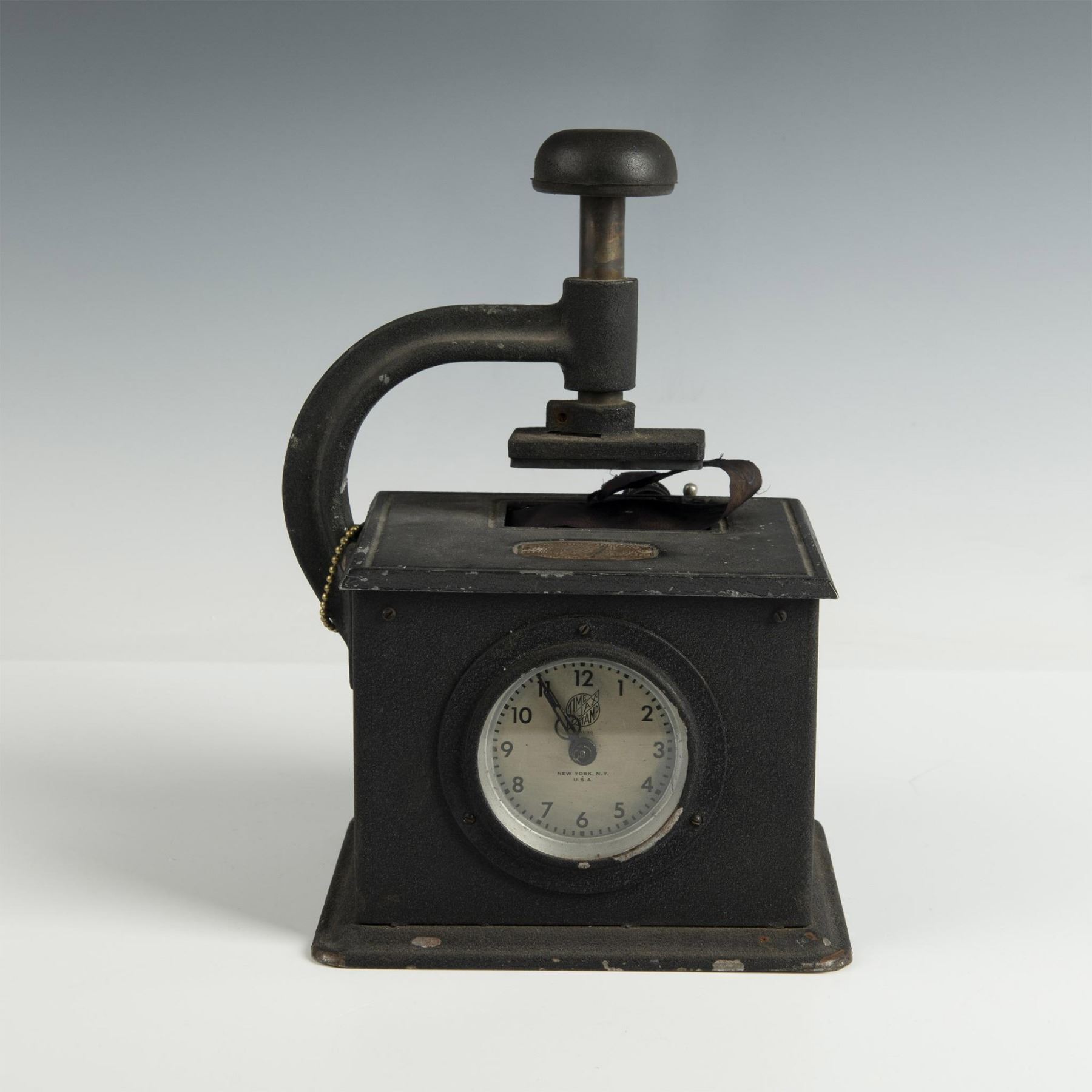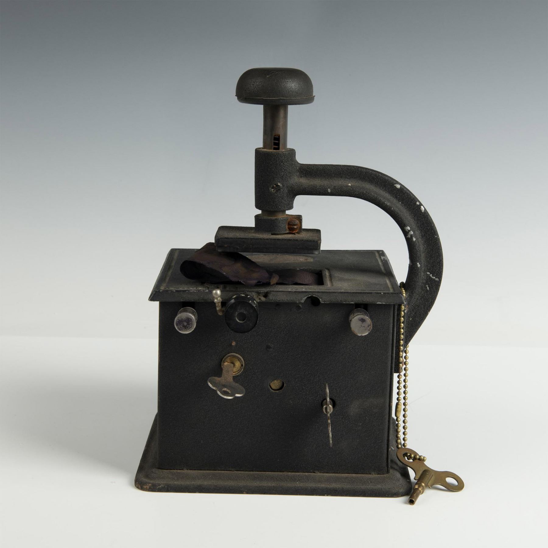 An antique mechanical time stamp which allowed users to imprint the date and time on documents, essential for companies tracking employee hours. Stamp for Second National Bank in Allentown, Pennsylvania.