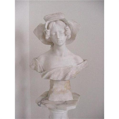 19th century Italian alabaster bust of a young girl wearing a large-brimmed bonnet; her curls frame her face nicely. Her low cut dress, trimmed with flowers, fetchingly reveals her bare shoulders and neck. Bust is 20" tall x 15" wide x 11" deep. Signed on reverse as shown in photo. Condition is excellent.