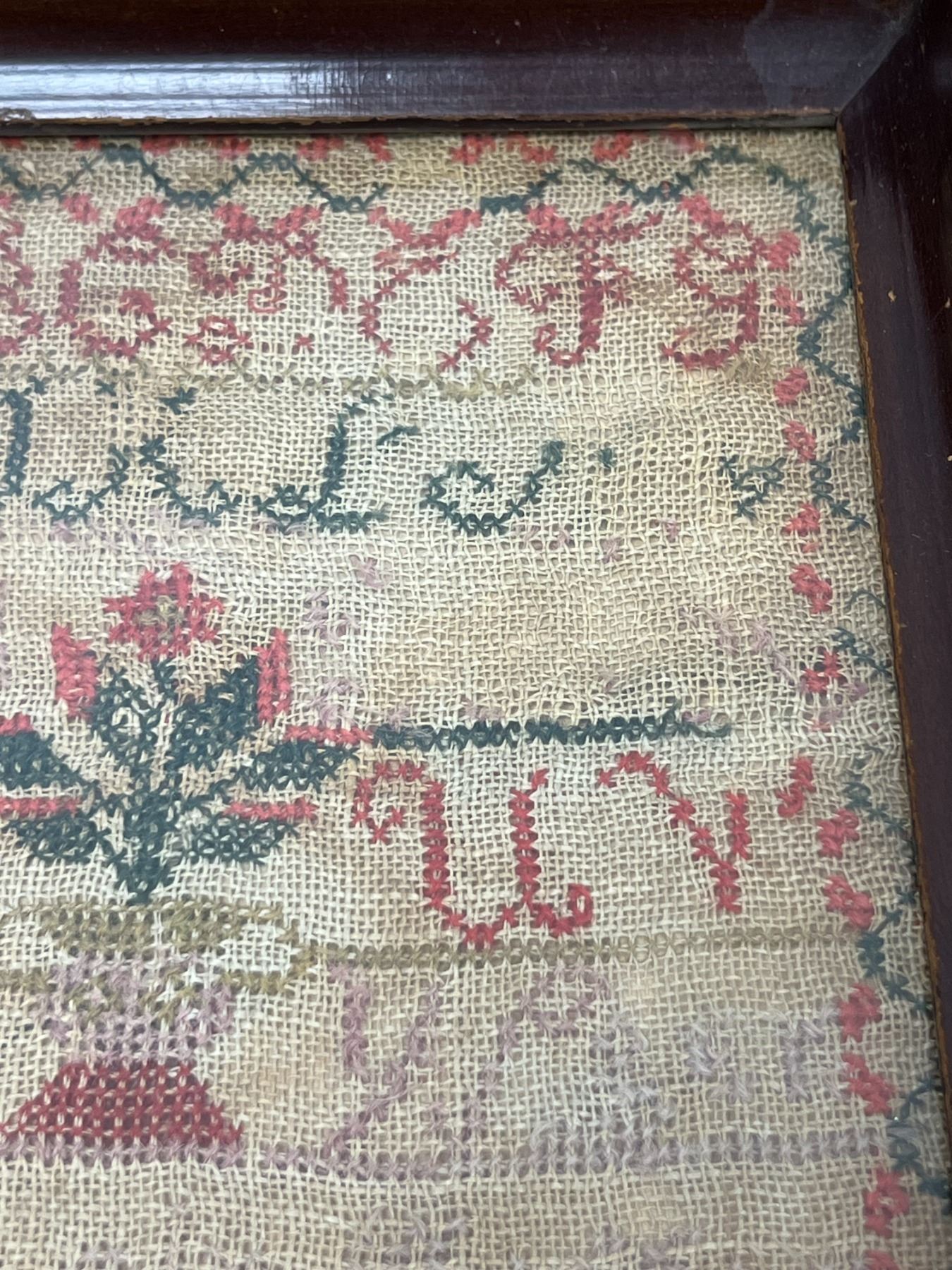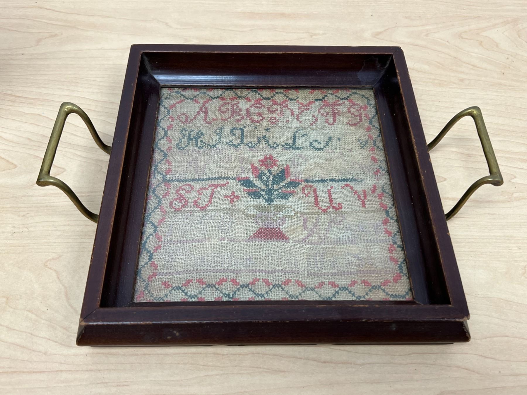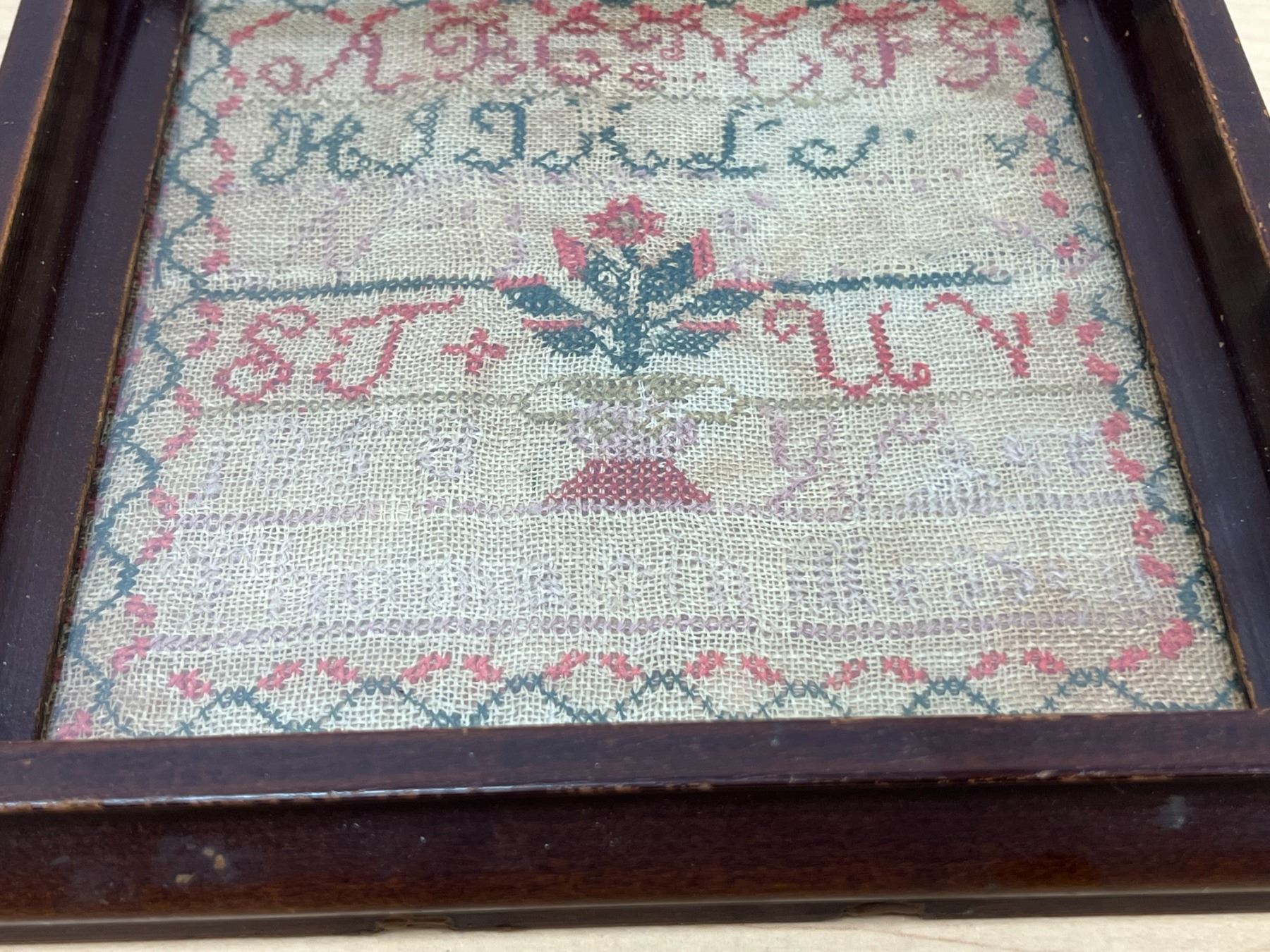 Antique Alphabet Sampler Stitching Needlework; Charming antique alphabet sampler. It almost looks dated 1898 but I'm not positive as the Colours seem faded somewhat, please view all pics. In a smaller tray type frame. Approx: 9x9.5" (not including handles)