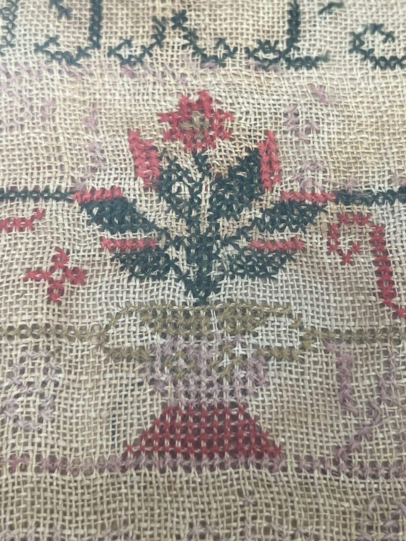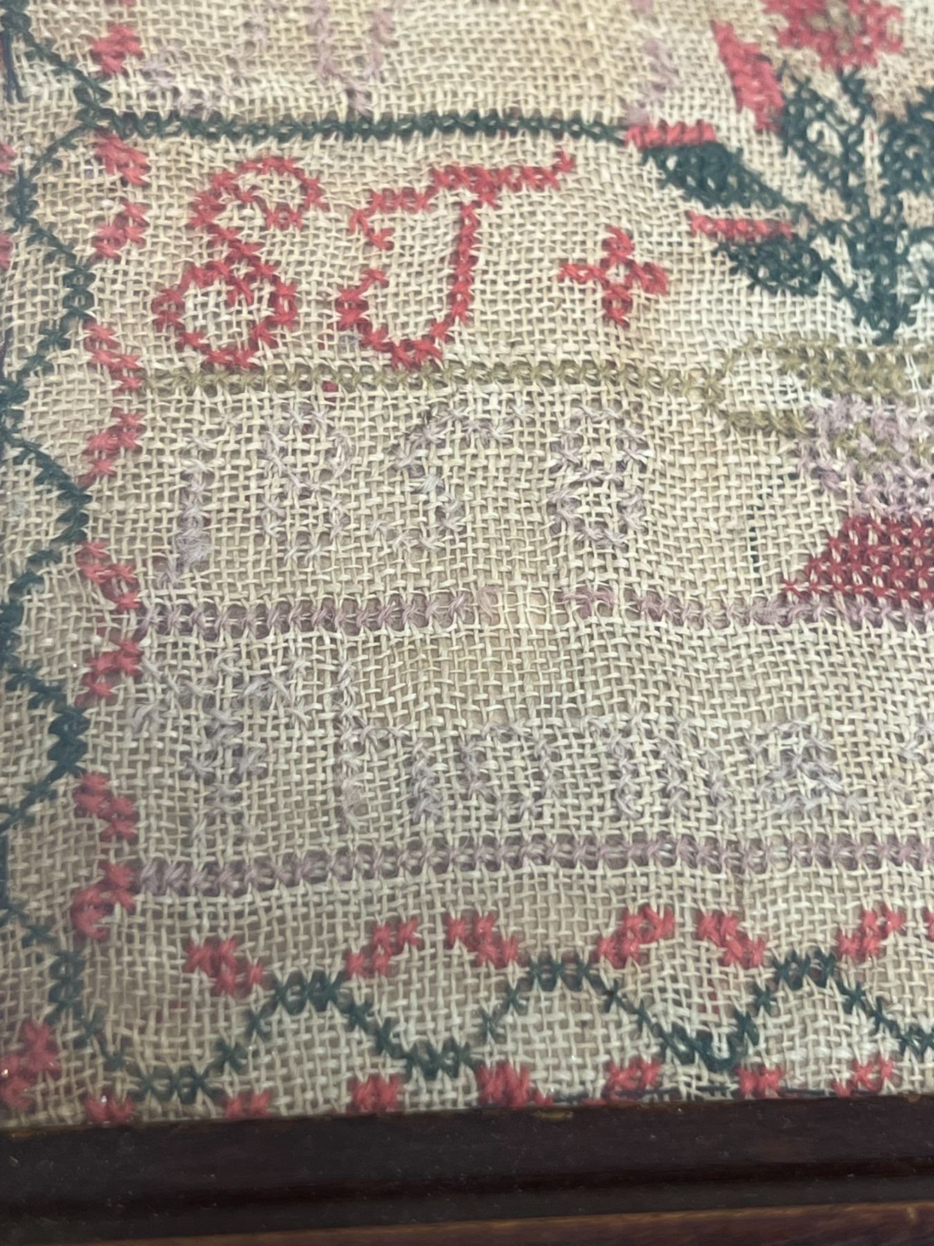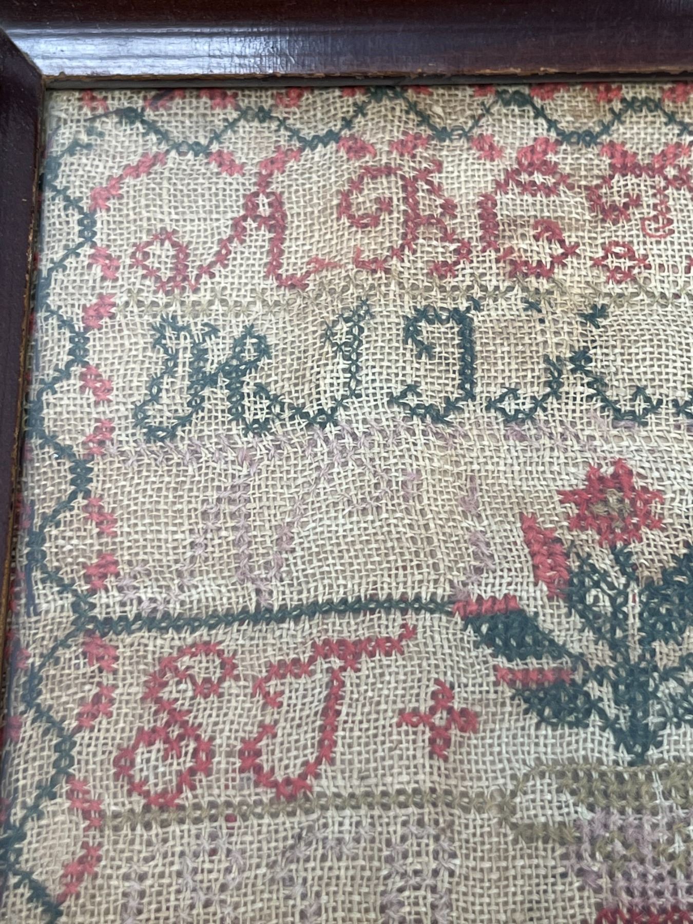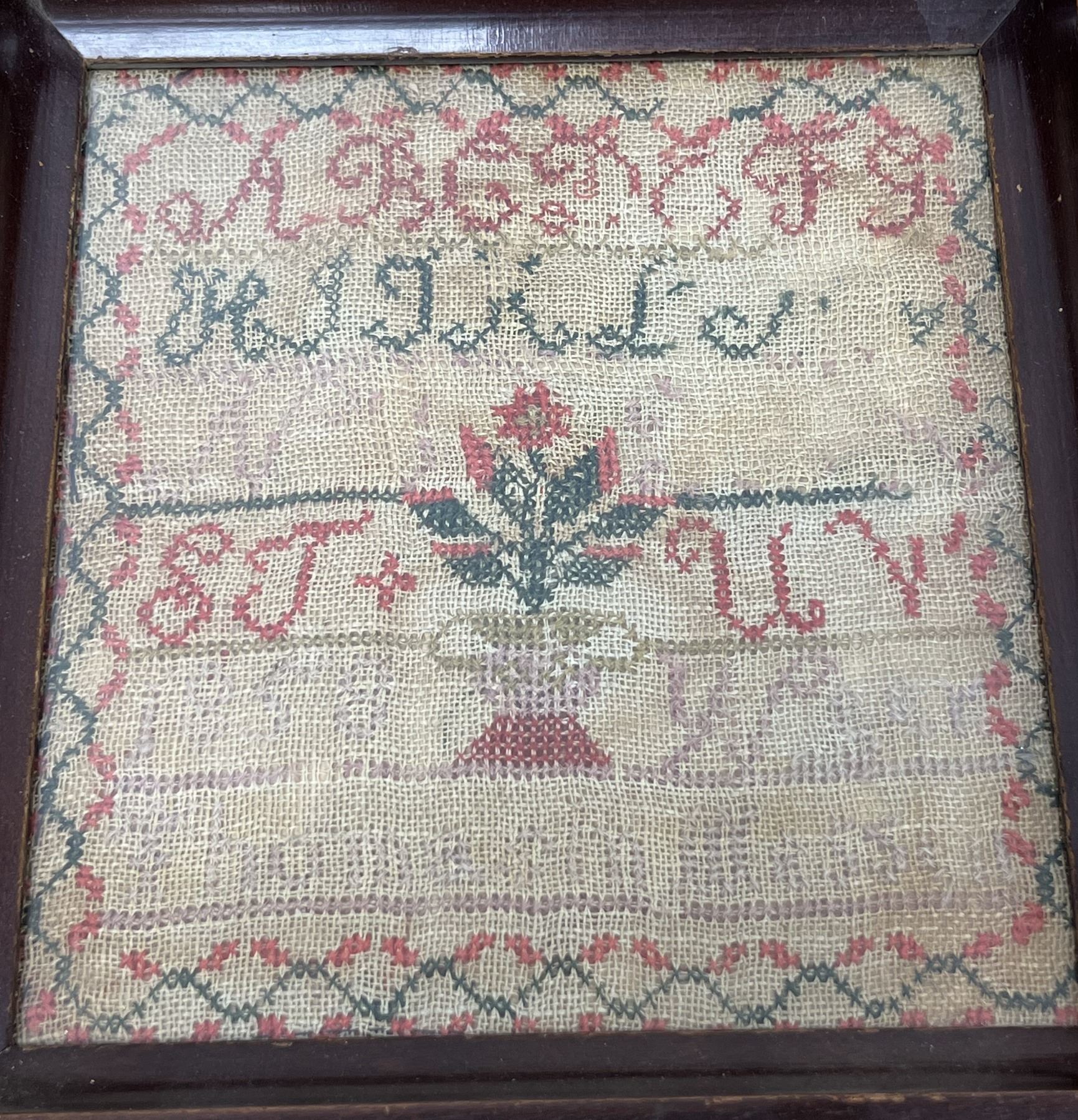 Antique Alphabet Sampler Stitching Needlework; Charming antique alphabet sampler. It almost looks dated 1898 but I'm not positive as the Colours seem faded somewhat, please view all pics. In a smaller tray type frame. Approx: 9x9.5" (not including handles)