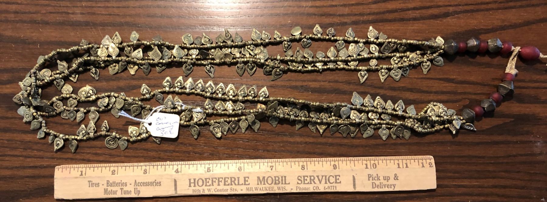 Description: An antique necklace of brass beads and spacers, with seven large red carnelian or amber beads. See Opitz, pp. 39-40.