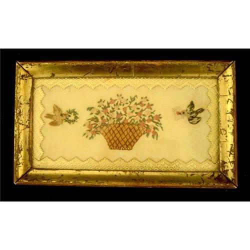 Mid-to-late 19th Century embroidery of a basket of flowers with birds, with a delicate gold scalloped border. In its original gold leaf frame. Very charming. A small jewel. In excellent condition.