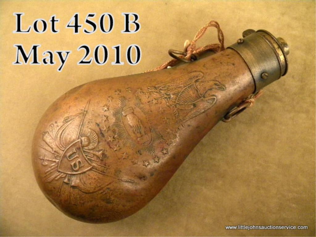 Antique American Flask & Cap Co. brass “peace” flask with classic “US” and stand of flags, shaking hands and American Eagle ornamentation on both sides; flask is uncleaned showing a mellow patina with some scattered dents and mars, bothhanging rings present and charging lever operational however the top portion of the spout has been cut off. Est.: $40-$80.