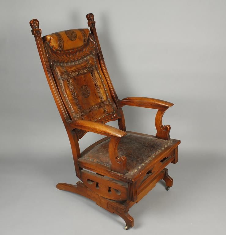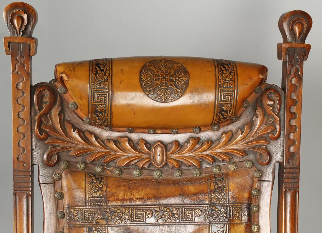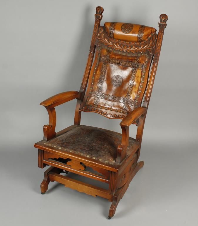 Antique American rocker with hand tooled leather seat and back, with floral brass nail-heads, lighter style, with intricate carving on back, circa early 1800-1850, the condition is overall fair to good as the seat shows age-however is still intact.