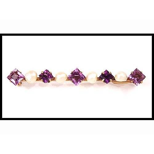 Long 14K gold antique pin is set with amethysts and pearls. Measures 52.5mm (2 1/16") long. Was priced for $760.